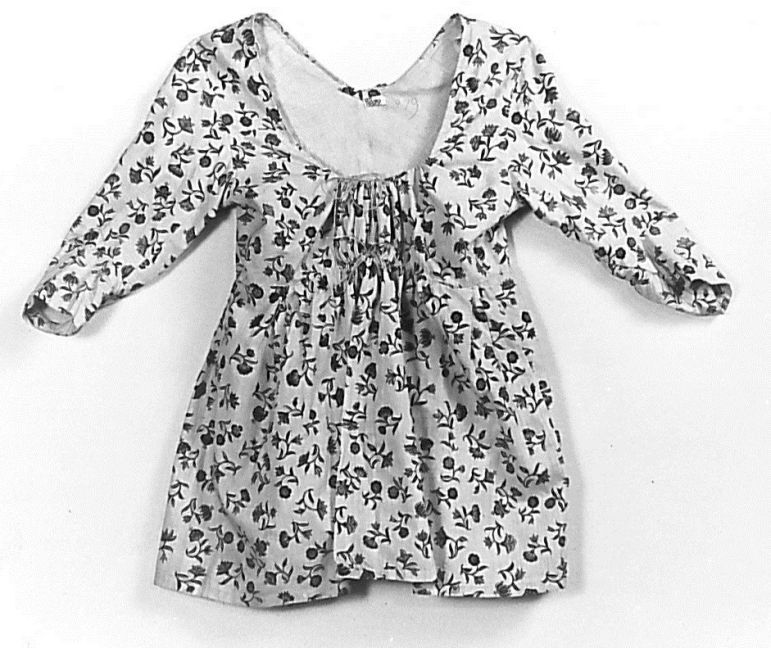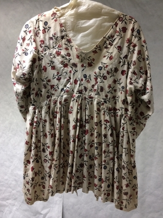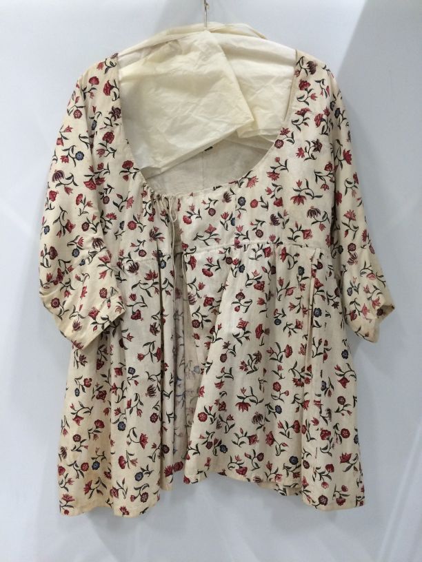 Sitsen vrouwenjak, met verhoogde taille en strooimotieven van a-symmetrische bloemetjes op witte grond