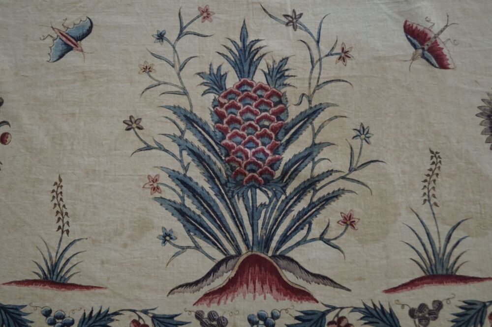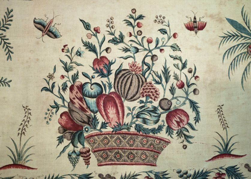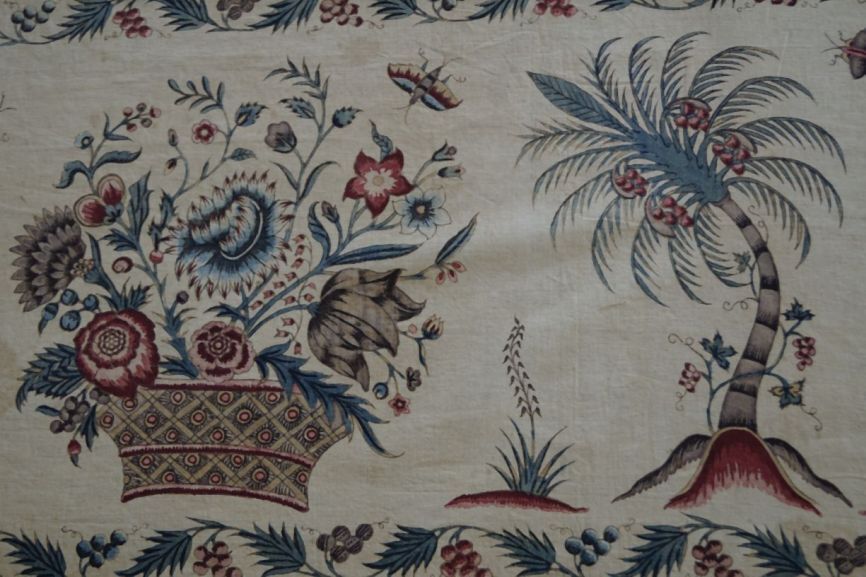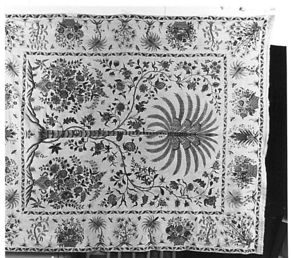 Sitsen palempore met stijve dadelpalm omrankt door bloemtakken, geflankeerd door bloemvazen