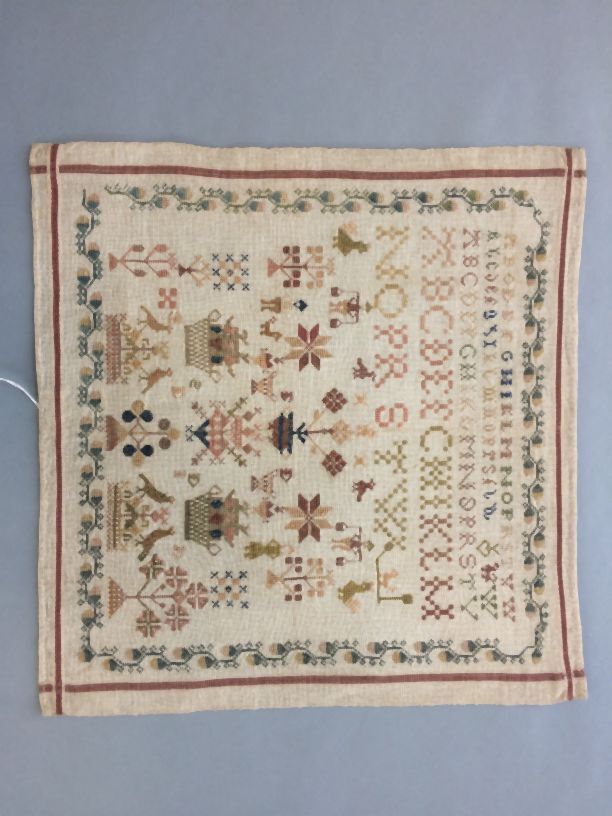 Lettermerklap van linnen, met zijde geborduurde kruissteek, ongemerkt