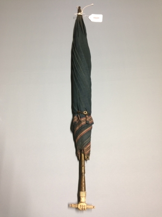 Groen linnen paraplu met rand, houten balleinen met koperen steunsels, koperen stok met benen knop in de vorm van vuist, een stokje ingeklemd
