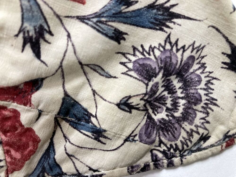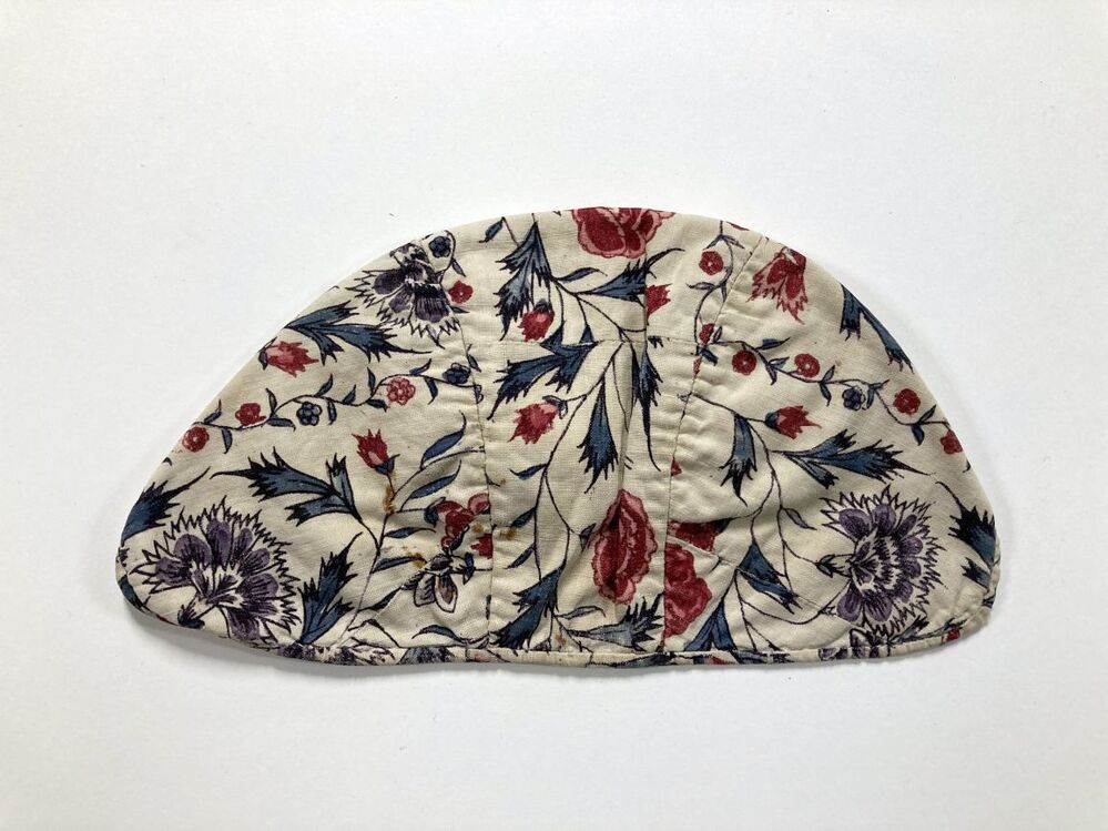 Sitsen meisjesmuts, met om en om grote en kleine lineaire bloemrank op witte grond