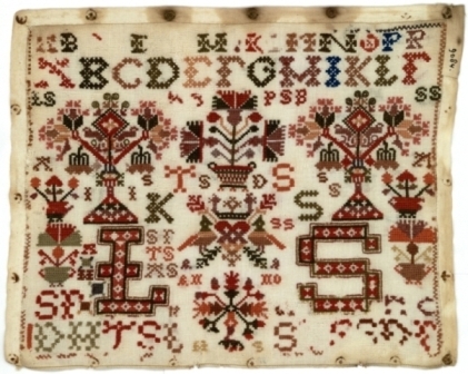 Lettermerklap geborduurd met wol, gemerkt L.S. 1852