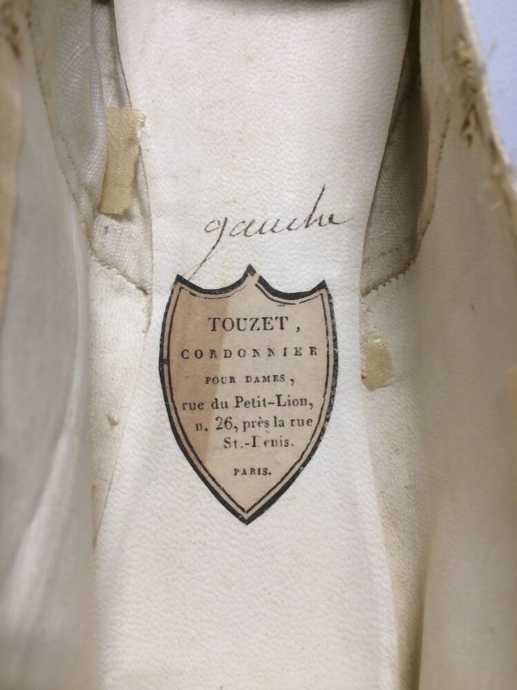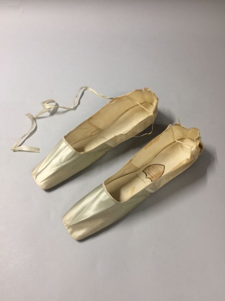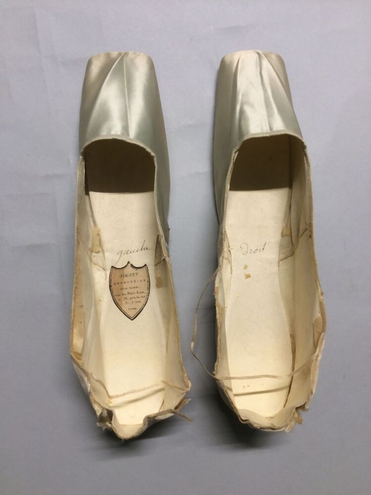 Paar bleekgroen satijnen platte schoentjes met vierkante neus, verstevigd met geitenleer en linnen, met zijden linten, gedragen door Alettya Aurelia van Hylckama, onderdeel van groep van zes paar