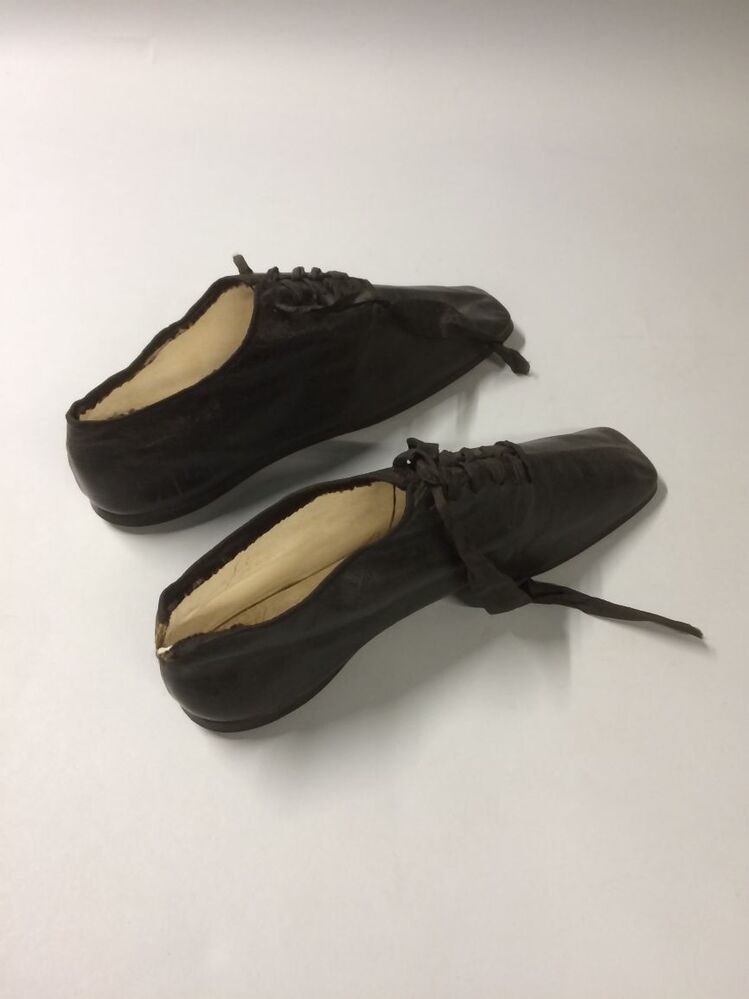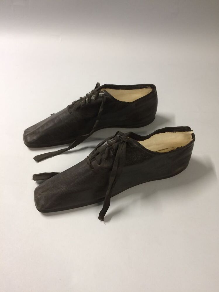 Paar smalle zwart leren mannenschoenen met vierkante neus en zijden lint als veter, gevoerd met wit geitenleer, onderdeel van groep van zes paar