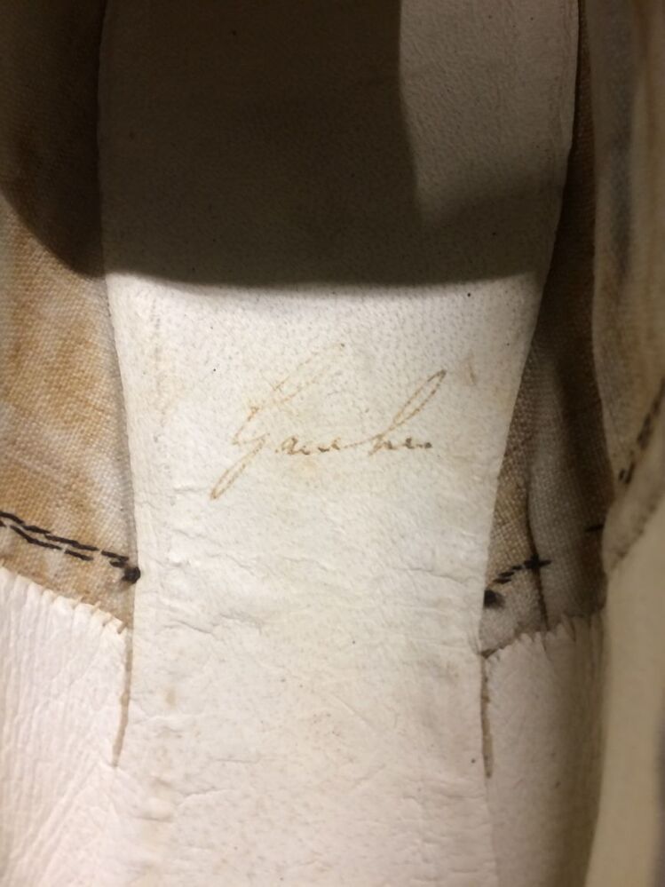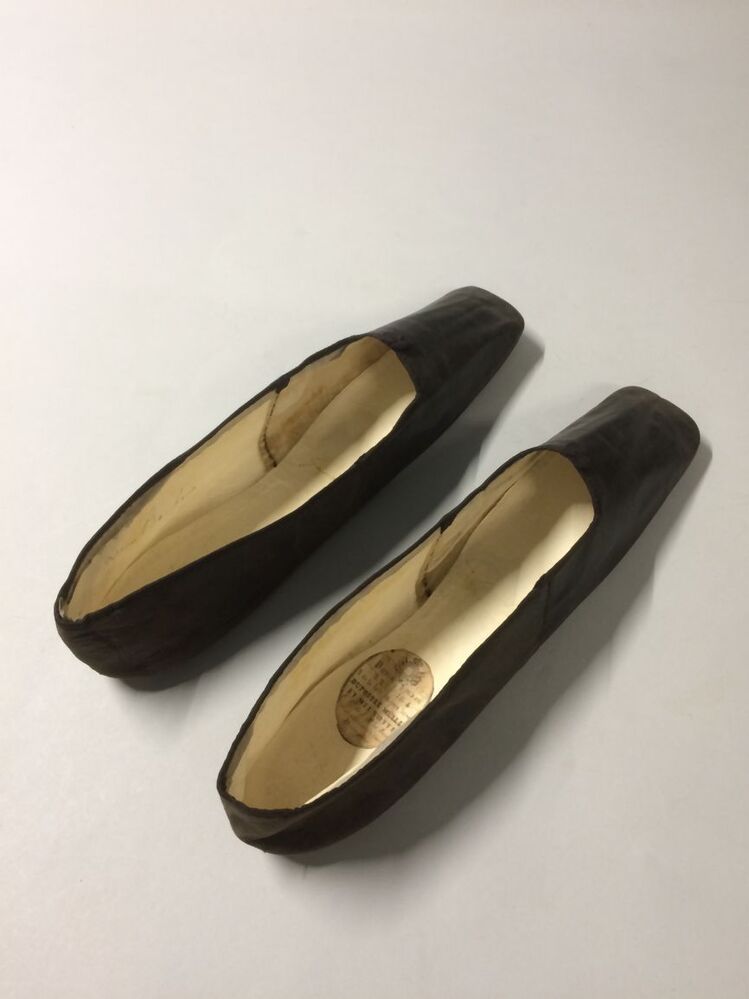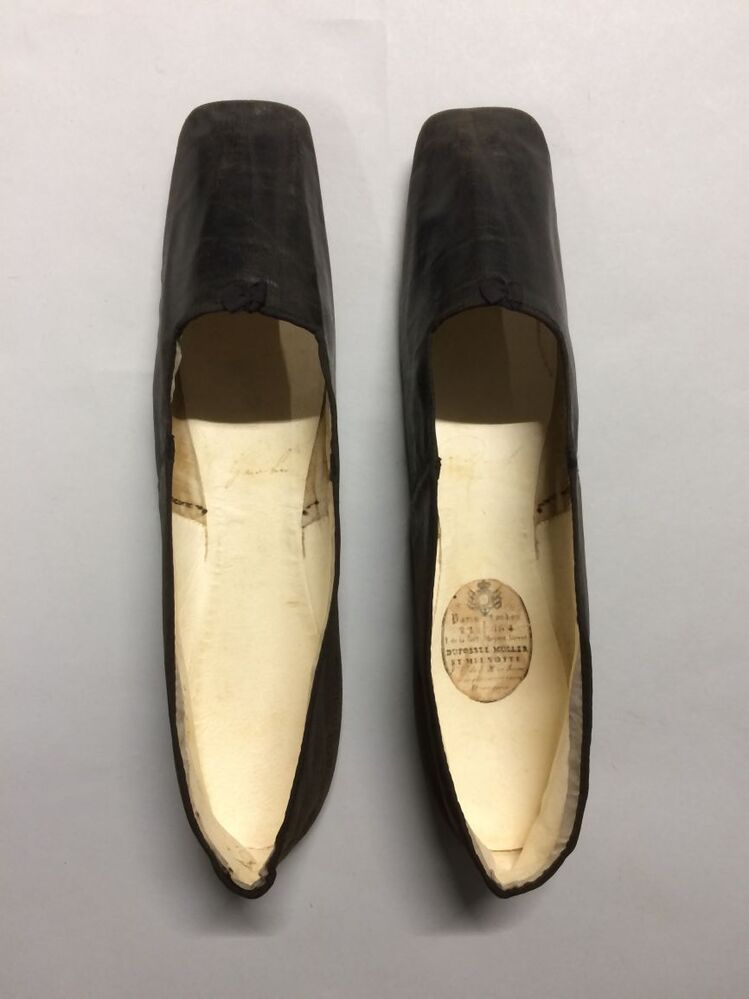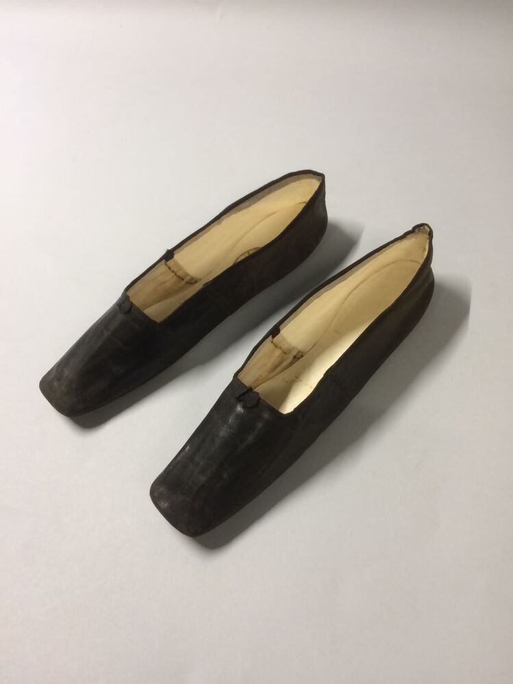 Paar zwart leren balschoentjes met vierkante neus en platte zool, gevoerd met wit geitenleer en linnen, afgebiesd met zwart-grijs zijden lint, gedragen door Alettya Aurelia van Hylckama, onderdeel van groep van zes paar