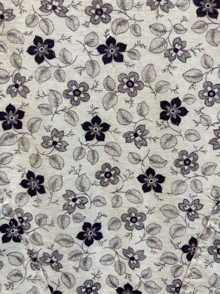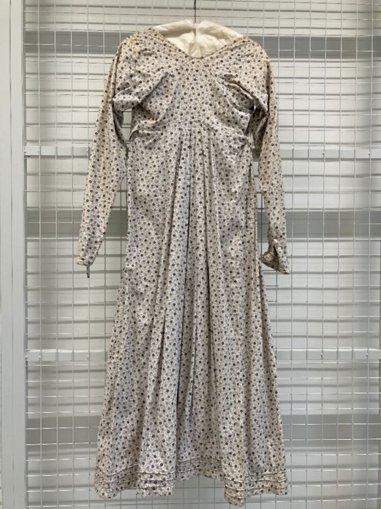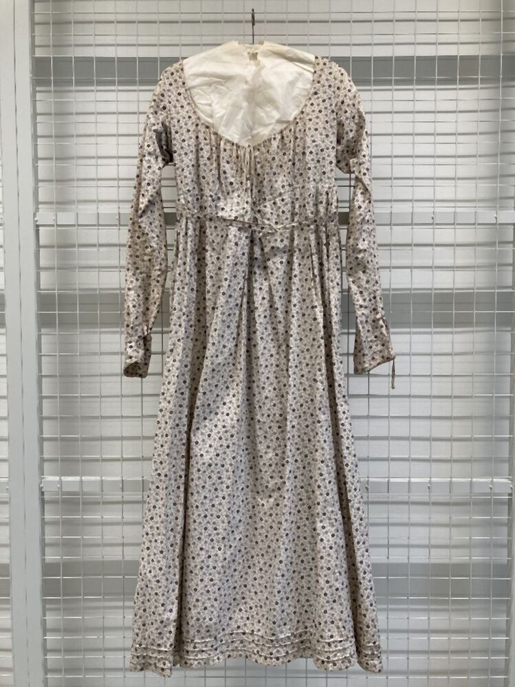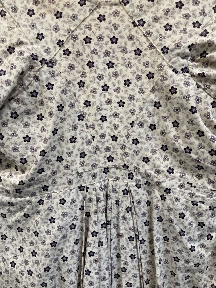 Bedrukt katoenen vrouwejapon, paars bloempatroon op witte grond. Empire