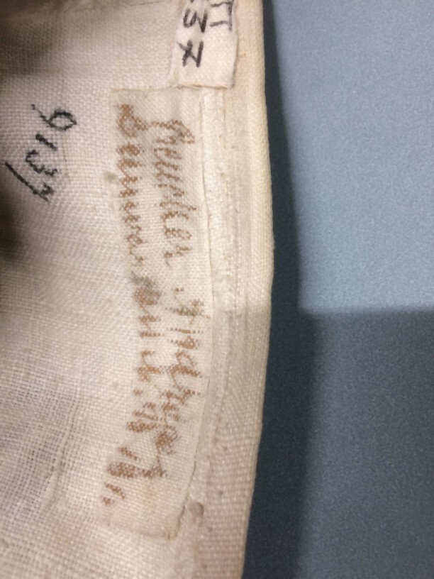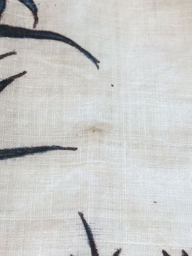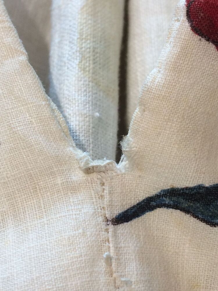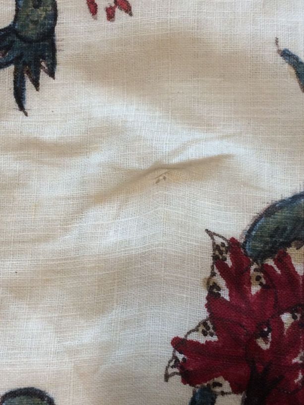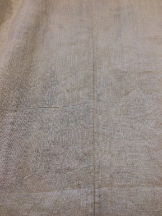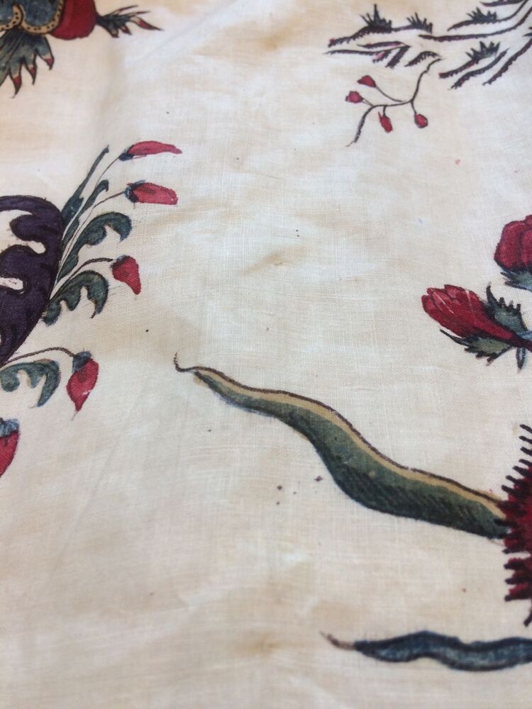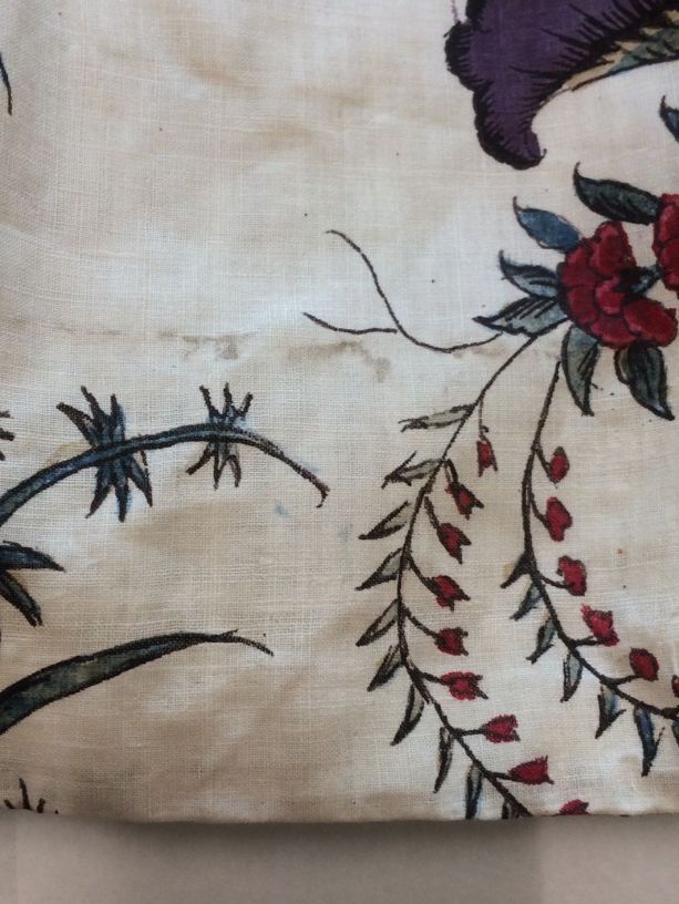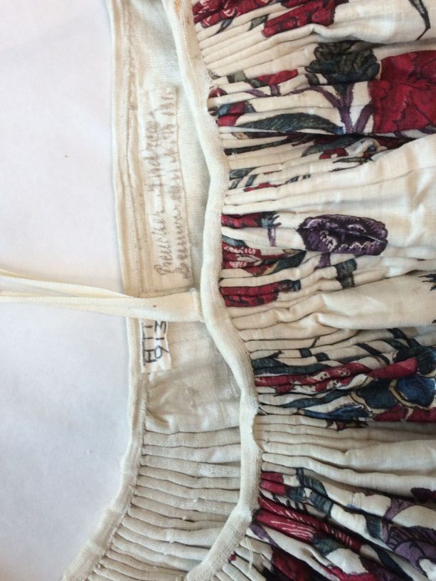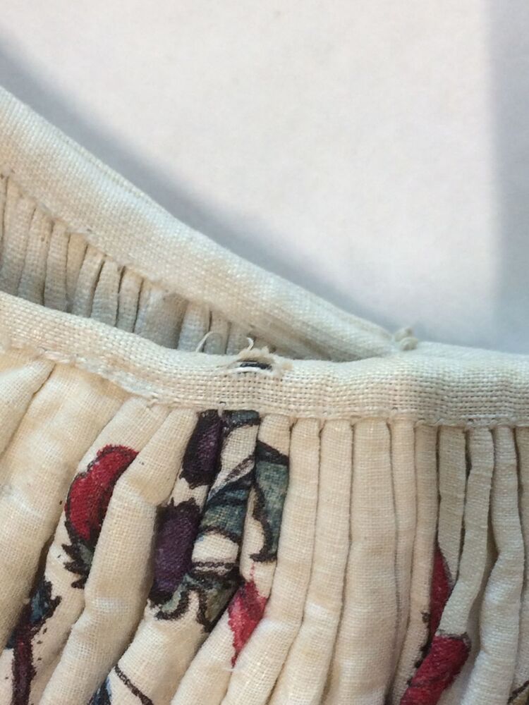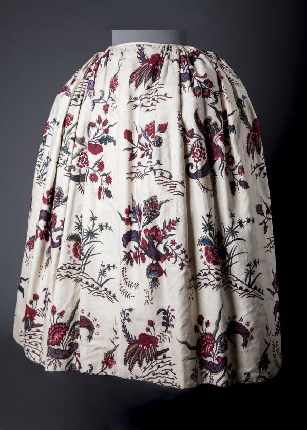 Sitsen vrouwenrok, met grote losstaande motieven, afwisselend hoorn des overvloeds met bloemen en 'grondje' met gras, bamboe en bloemen op witte grond.