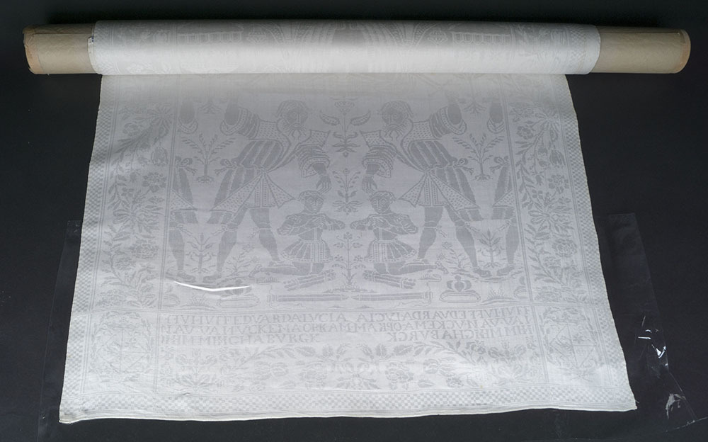 Servet van wit linnen damast met spiegelend patroon van Abraham's offer in Genesis 22, wapen en naaminweving, onderdeel van groep van vijf servetten en één tafellaken