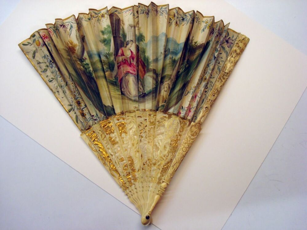 Vergulde waaier van papier met waterverf en besneden been, op voorkant landschap met zuilen en op achterkant herderin in landschap