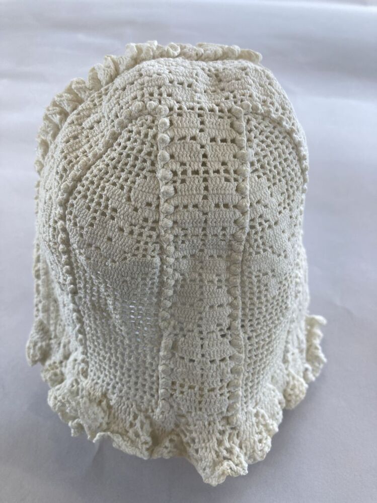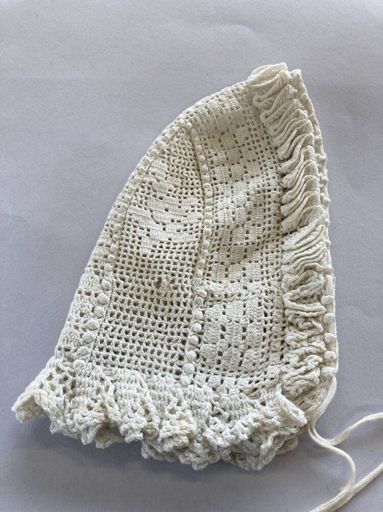 Wit gehaakt katoenen mutsje in filethaakwerk met noppenranden en hanekam