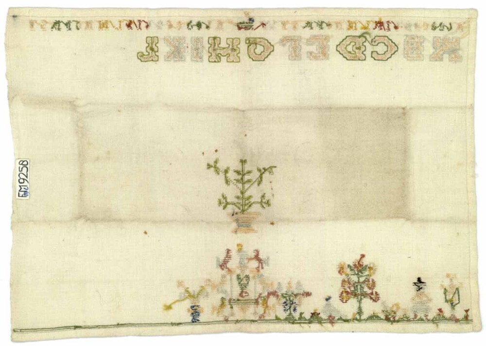 Merkletterlap onaf, geborduurd op katoen, met half grondje.