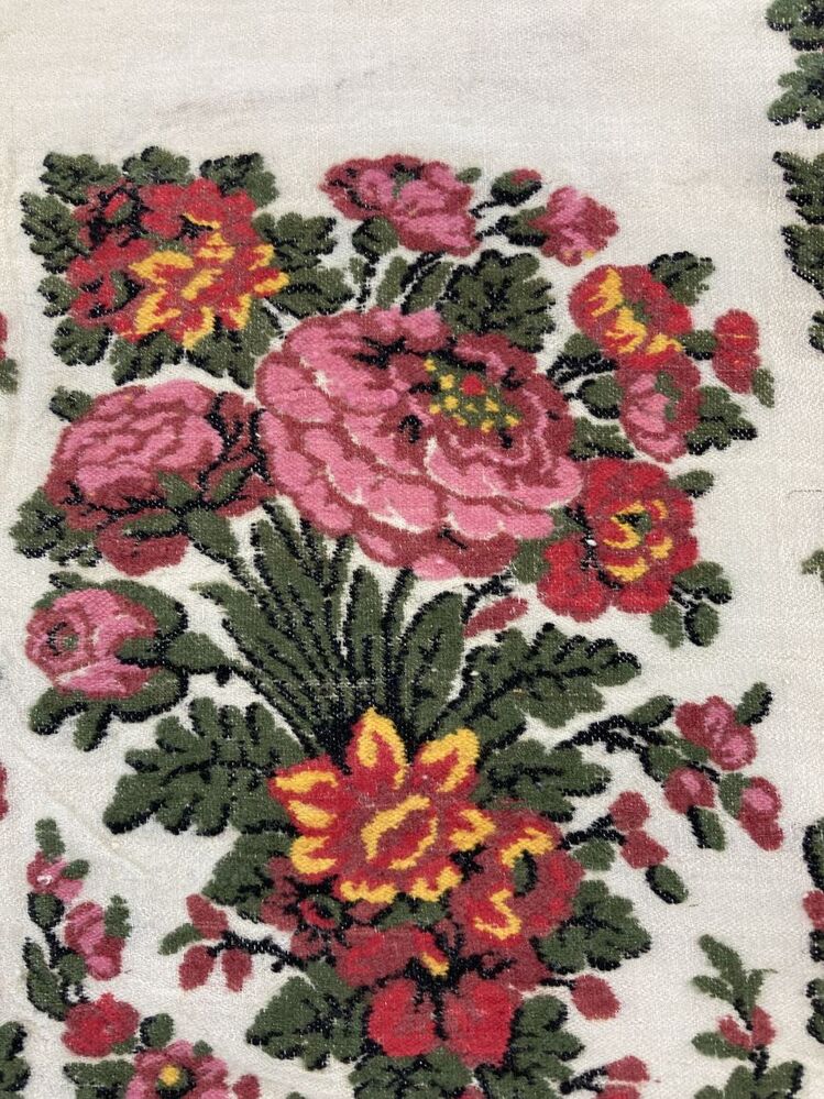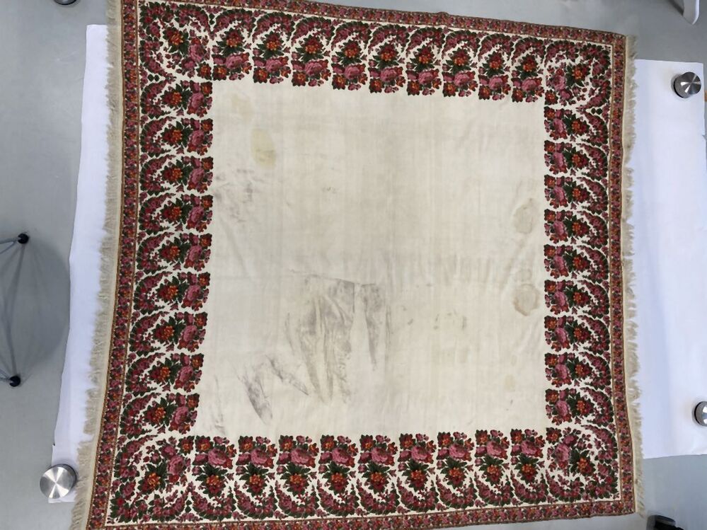 Omslagdoek van wol met ingeweven randen langs de vier zijden, veelkleurige boeketten rozen
