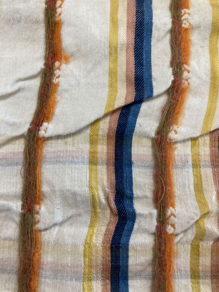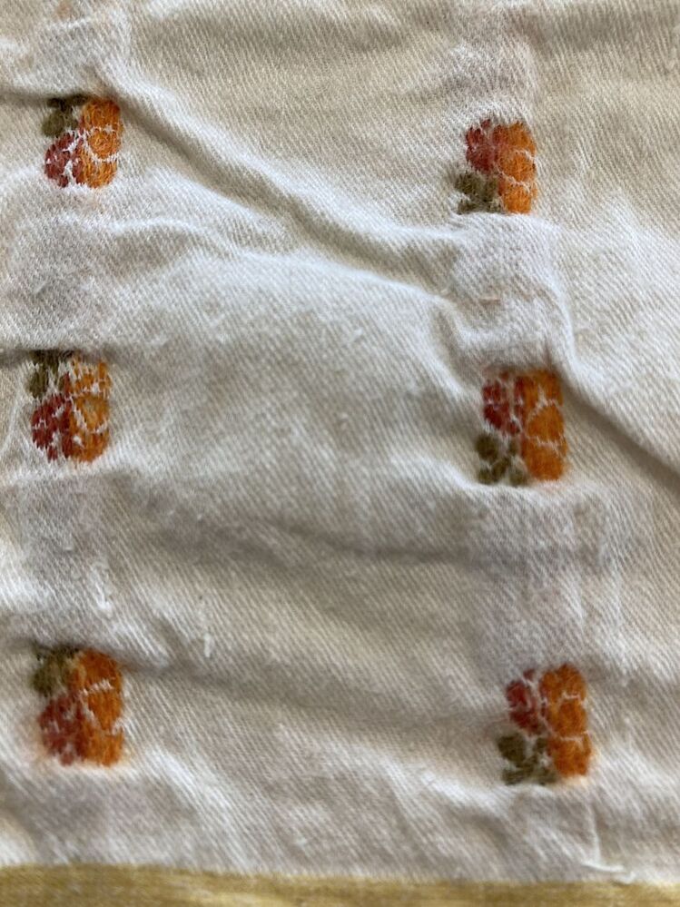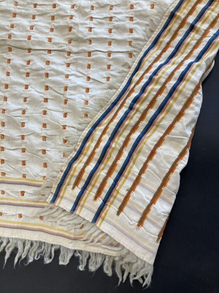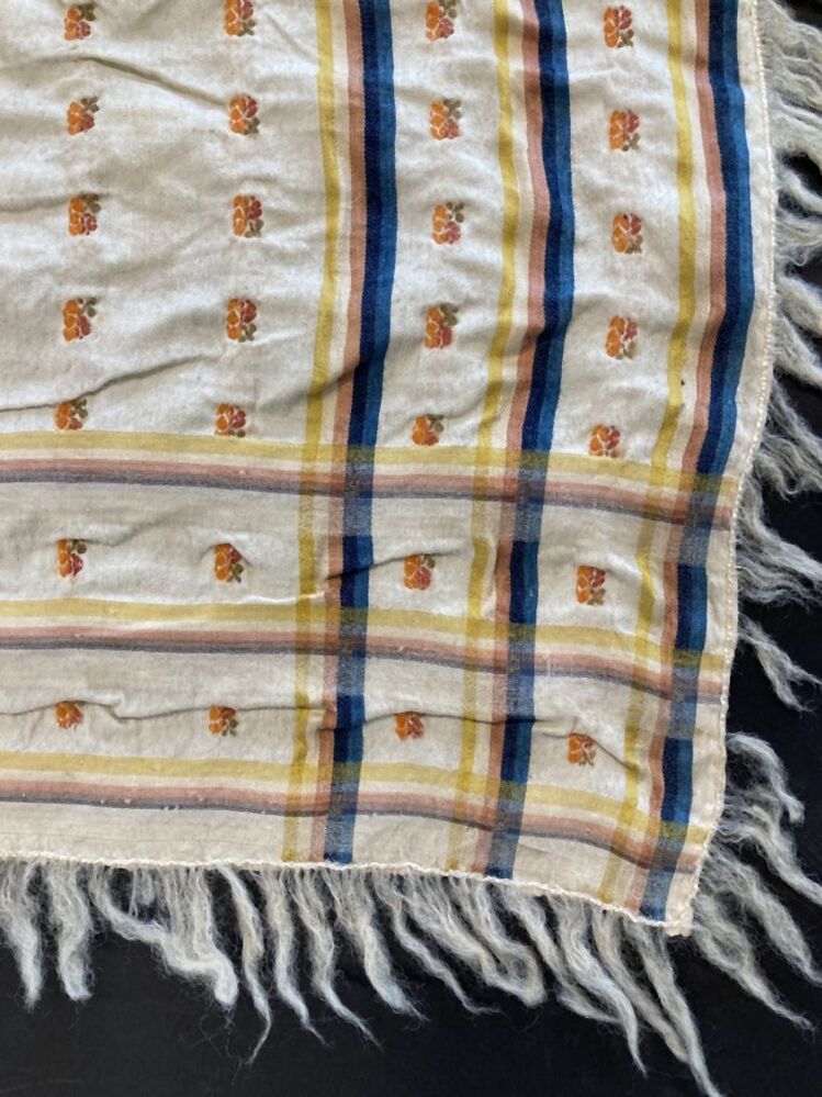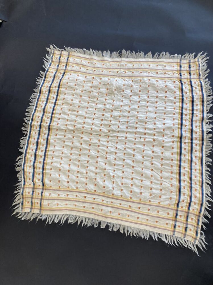 Vierkante doek in wit met gekleurde strepen, randen rijen gebrocheerde oranje bloemetjes en aan vier zijden wollen franje