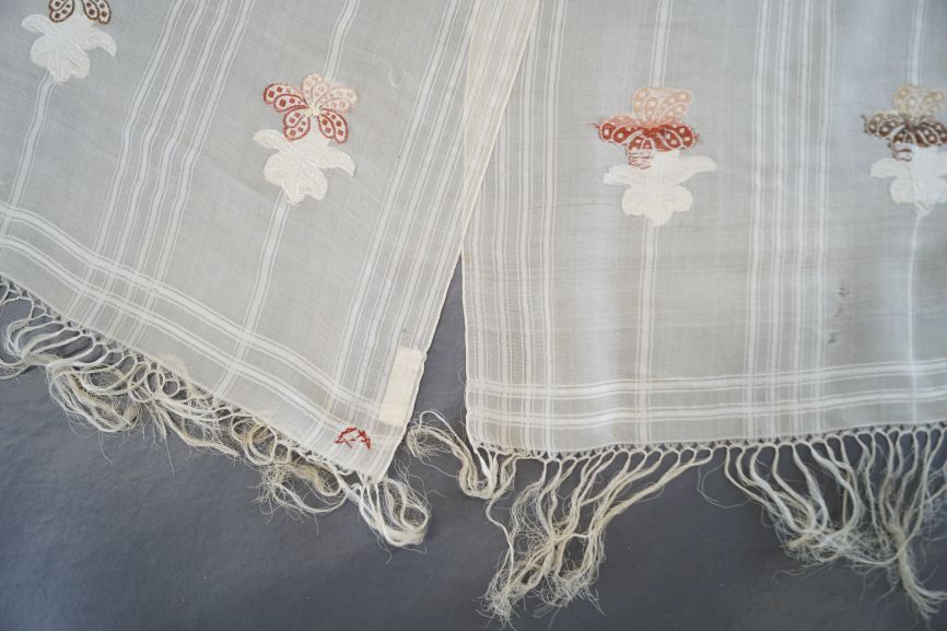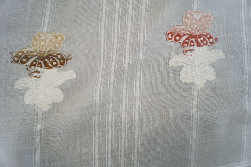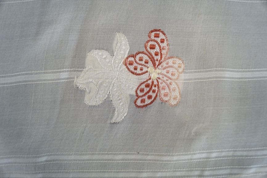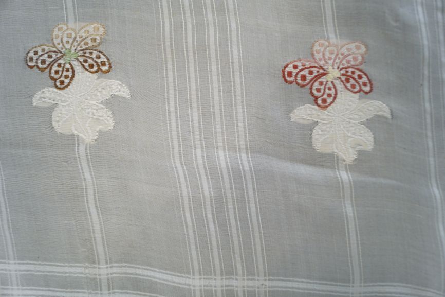 Sjaal van dunne creme zijde met ingeweven strepen en gebrocheerde gekleurde bloemen
