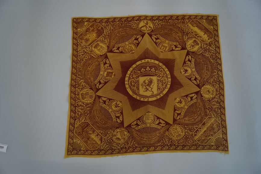 Bedrukte katoenen gedenkdoek in geel en rood betreffende de geallieerde landen tegen Frankrijk