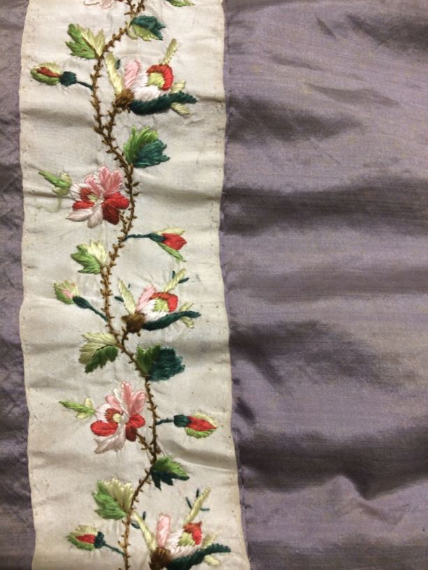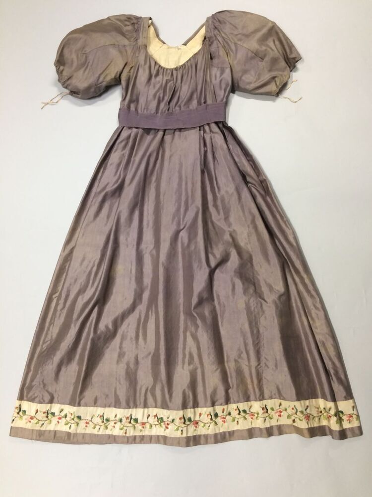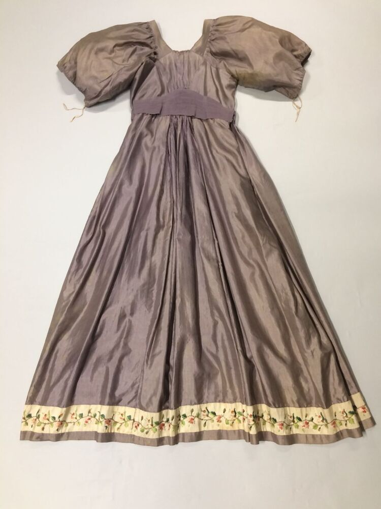 Empirejurk van paarse zijde met pofmouwen, onderaan lint met geborduurde bloem- en bladversiering