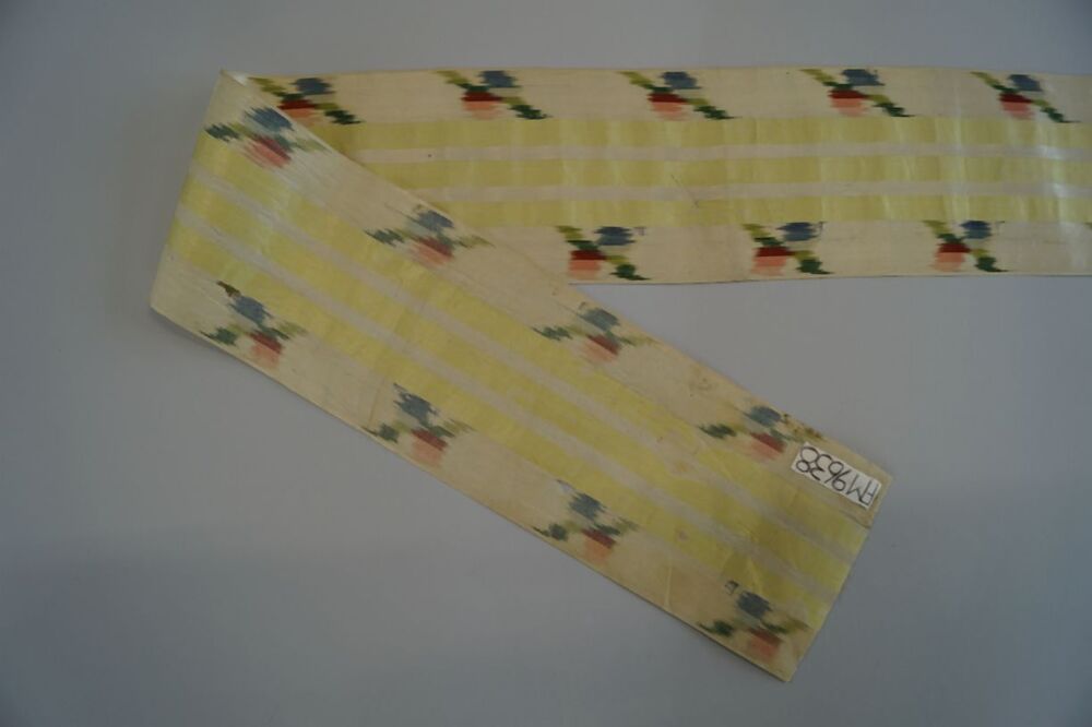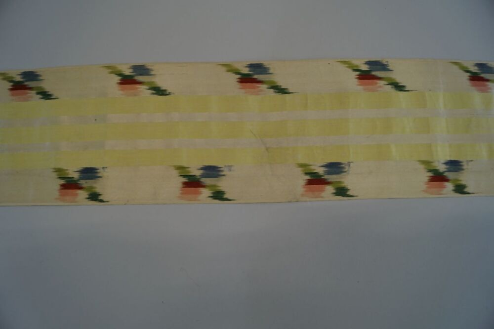Zijden lint met ingeweven gele strepen en veelkleurige 'vervaagde' bloemen