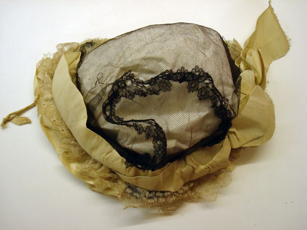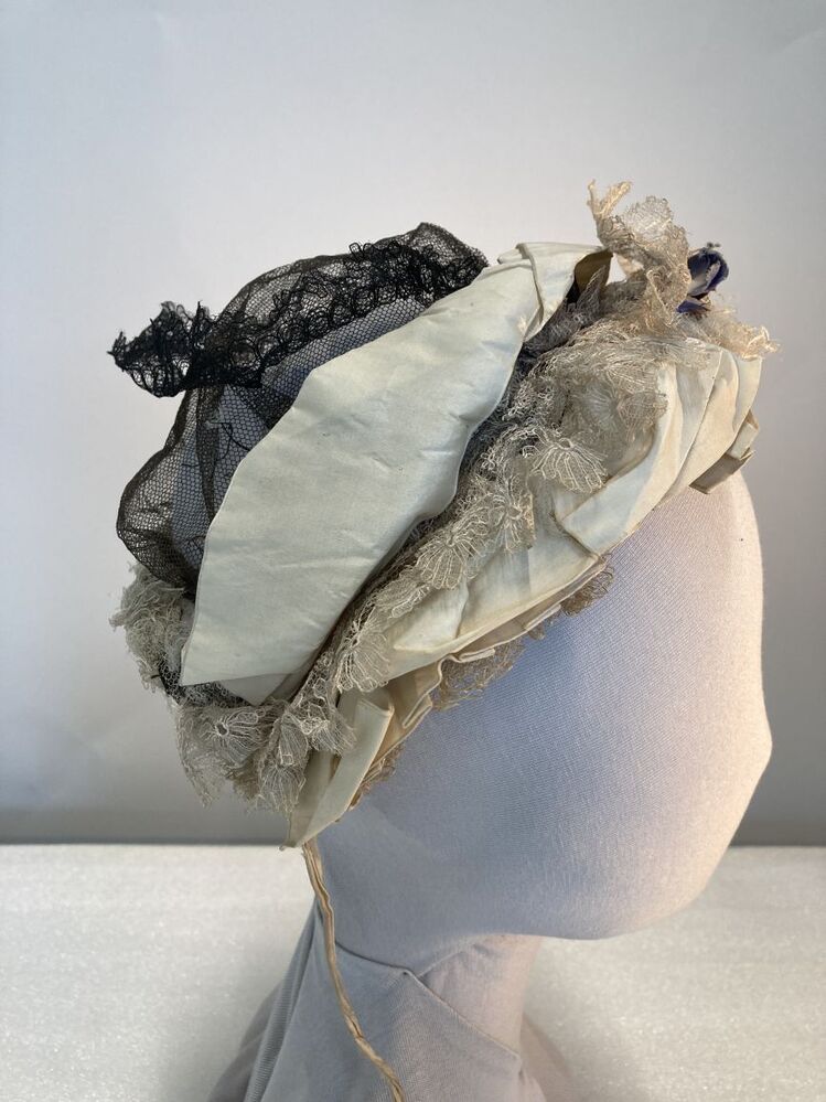 Zomerhoedje van zwarte tule, ecru kant en strikken van ecru zijden lint, bloemetjes, verstevigd met laitondraad