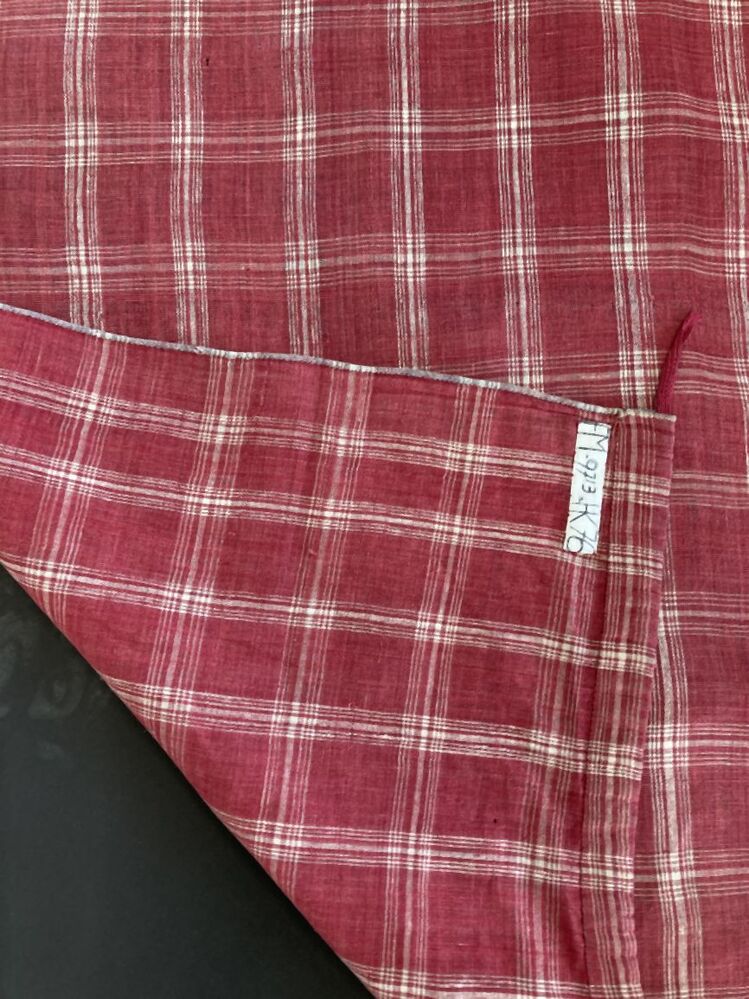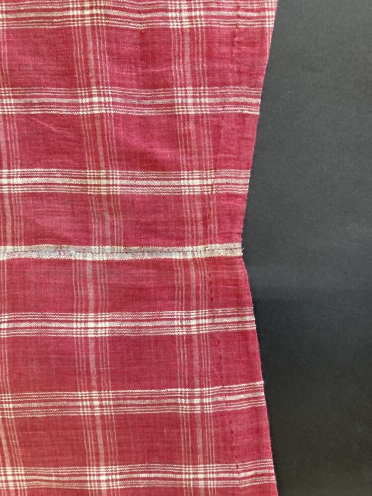 Schort van bont katoen met ingeweven ruit, rood fond met witte strepenbundels