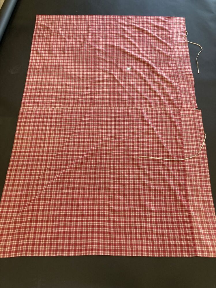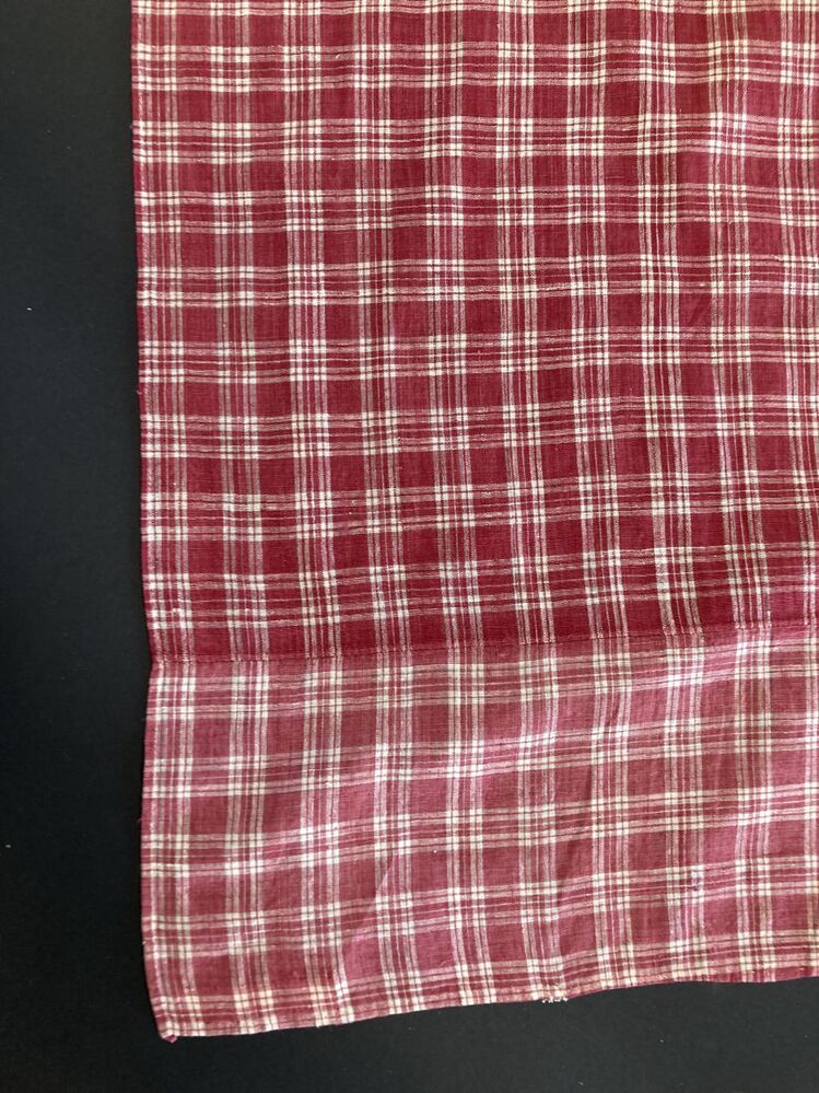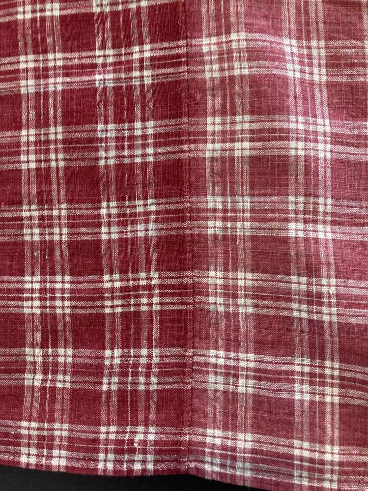 Schort van bont, ingeweven ruit met rood fond, witte bundels van vijf strepen