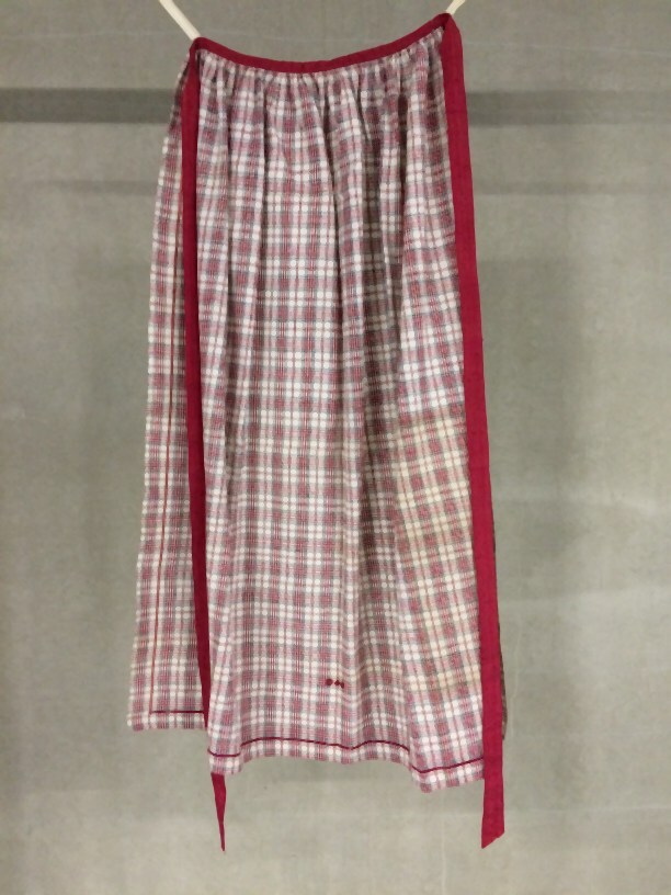 Hindelooper schort van wit, rood en blauw geruit bont met rode zoom en tailleband