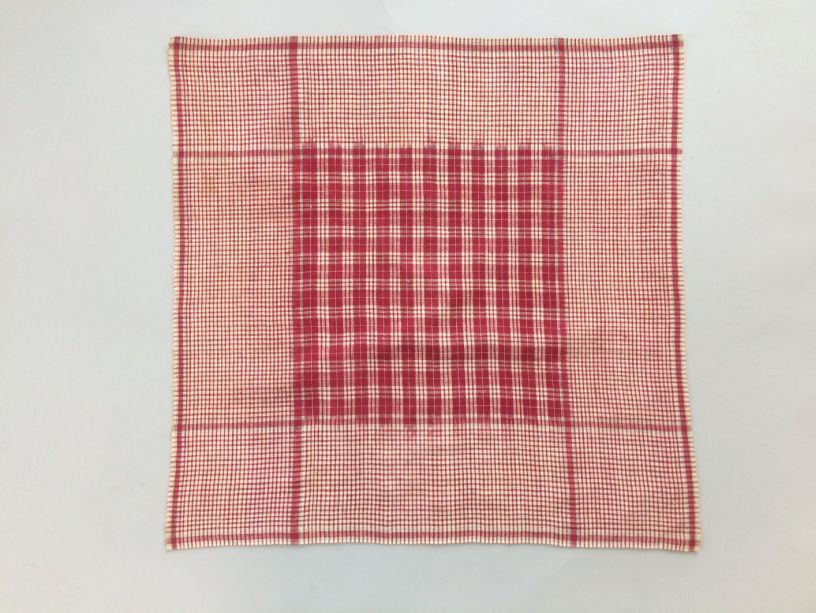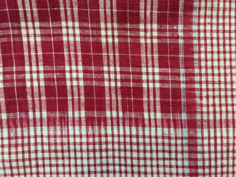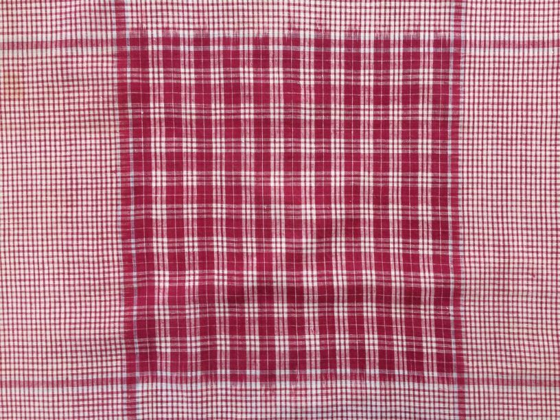 Sondook met ingeweven ruit in rood en wit met lapkede (Piejoende) in ikat-techniek
