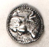 Platte ronde knoop met achterop een oogje, op de knoop een borstbeeld van prins Willem V