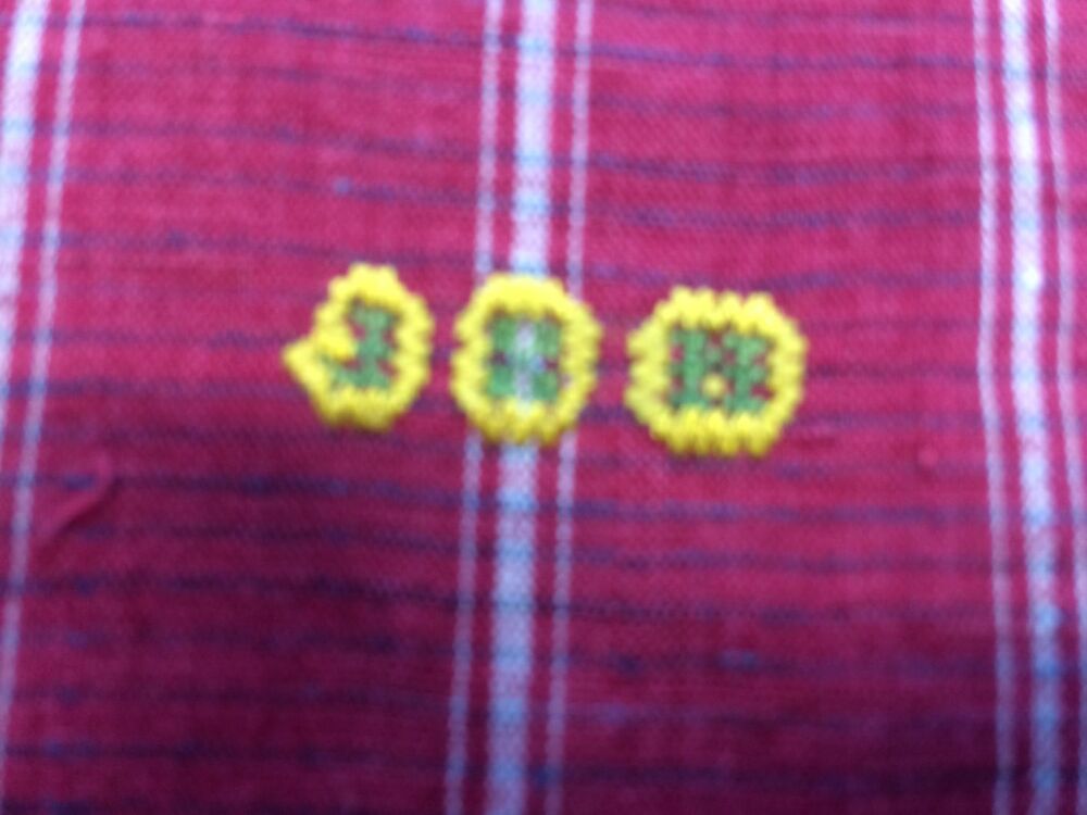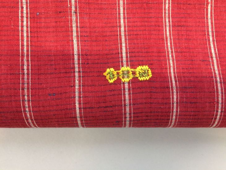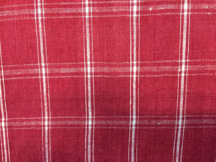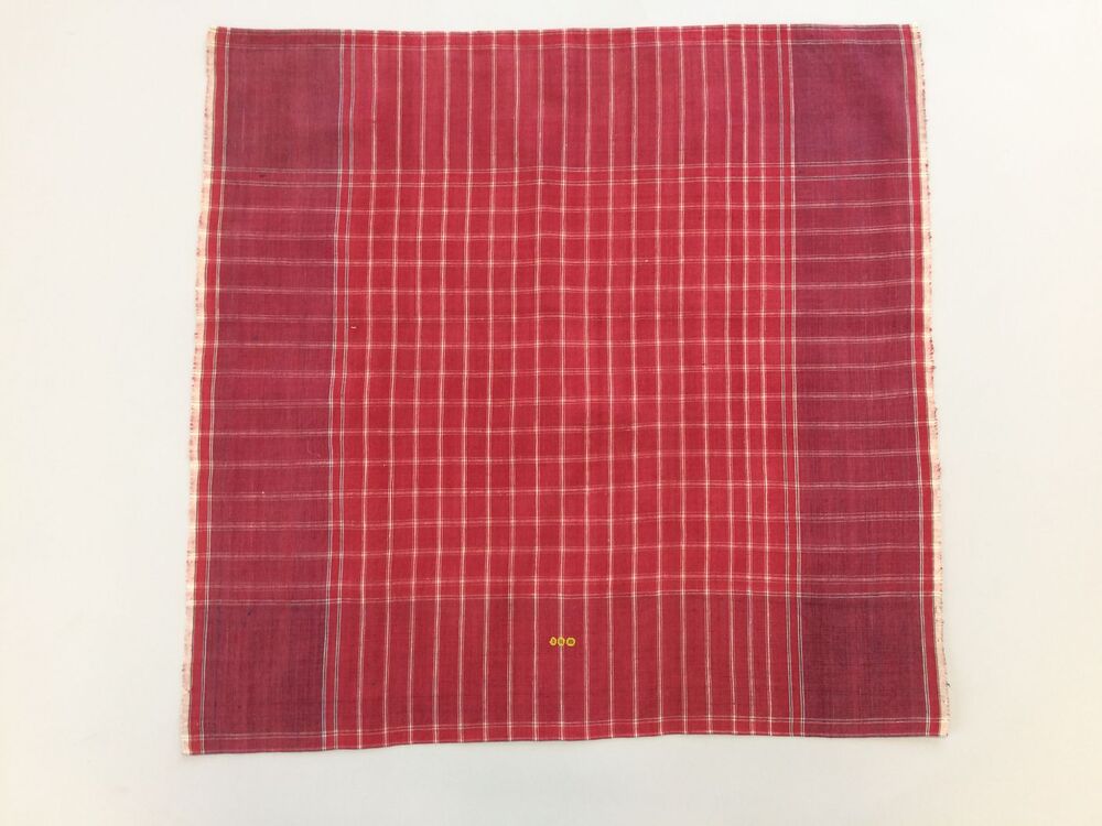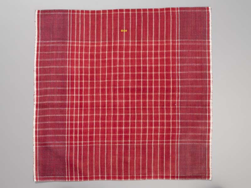 Rode Hindelooper sondook met ingeweven ruit in wit, met blauw in de randen en geborduurde initialen HF