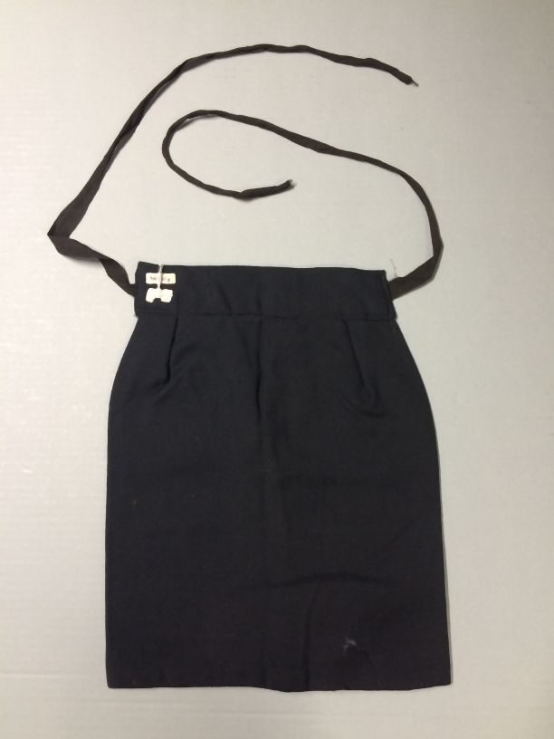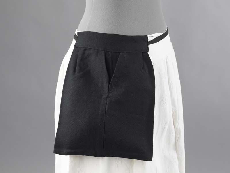 Voorspanzak van zwart wollen keperweefsel, machinaal genaaid met katoenen banden