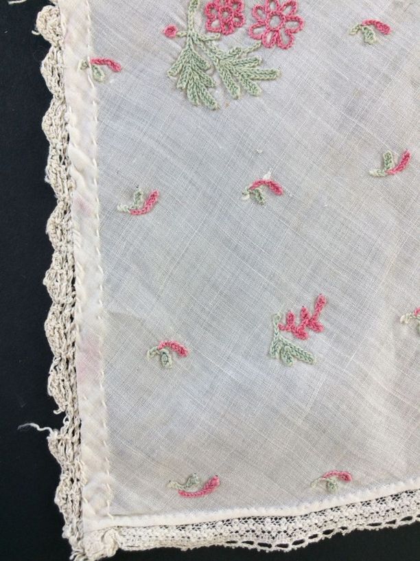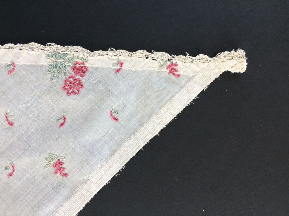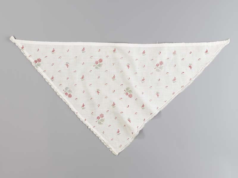 Meisjestipdoek van wit katoenen batist getamboereerd met groen met rode bloemmotiefjes en blaadjes, langs de rechthoekzijden: een machinaal kloskantje, langs de andere een gebreid kantje; De lange zijde heeft dikkere ingeweven draden en is de zelfkant van de stof, deze is omgeslagen en gezoomd met rijgsteek. Vormt oorspronkelijk één geheel met T11204