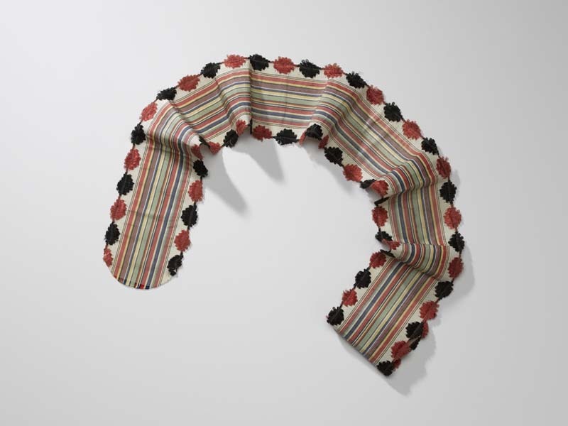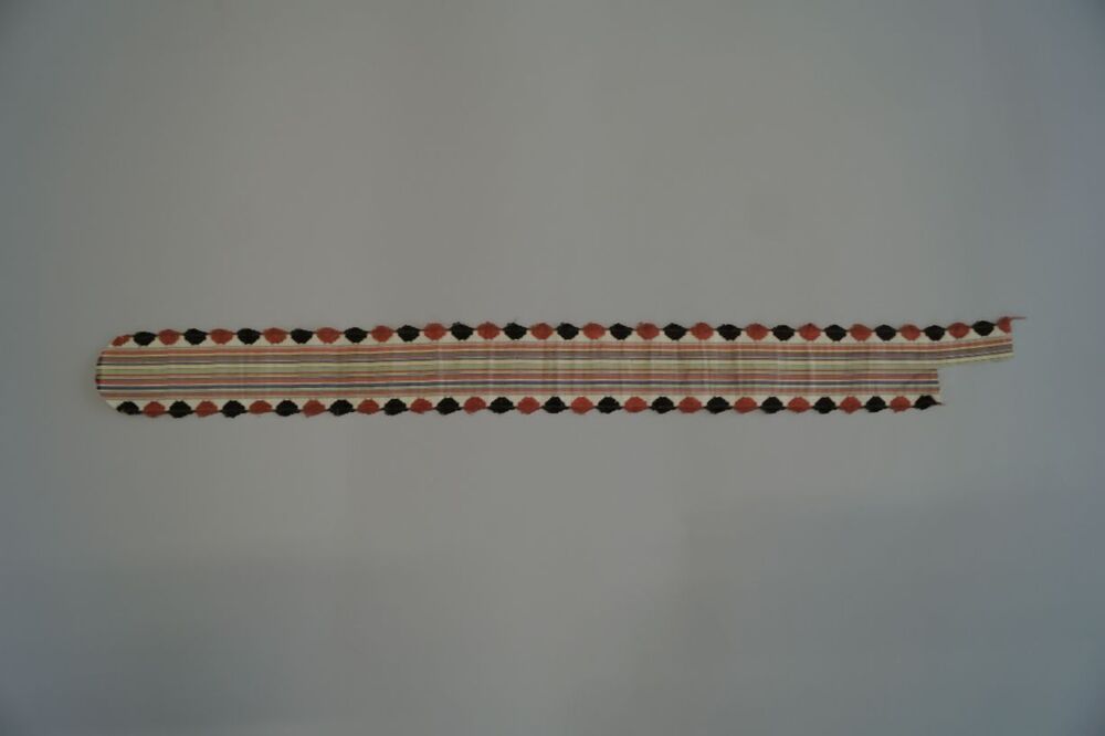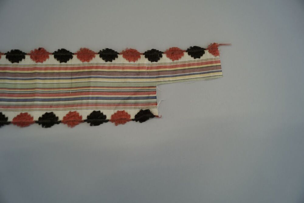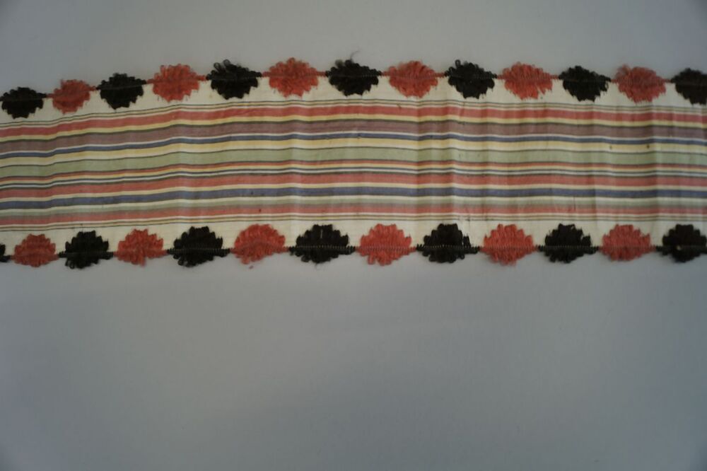 Zijden lint met gebrocheerde ovalen langs de rand en veelkleurige strepen