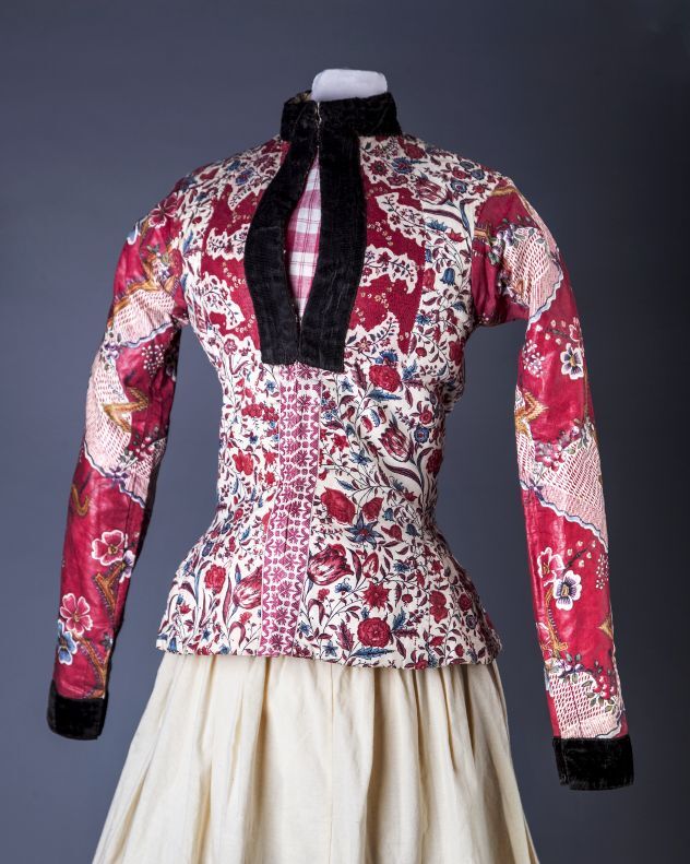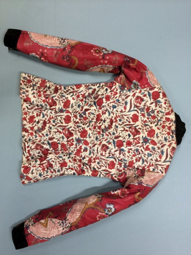 Hindelooper onderst oerlof voor de zomer, van Europees bedrukt katoen met sitsmotieven op witte grond, mouwen van Indiase sits met rode grond, frontjes idem met witte grond.