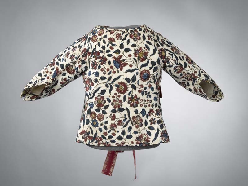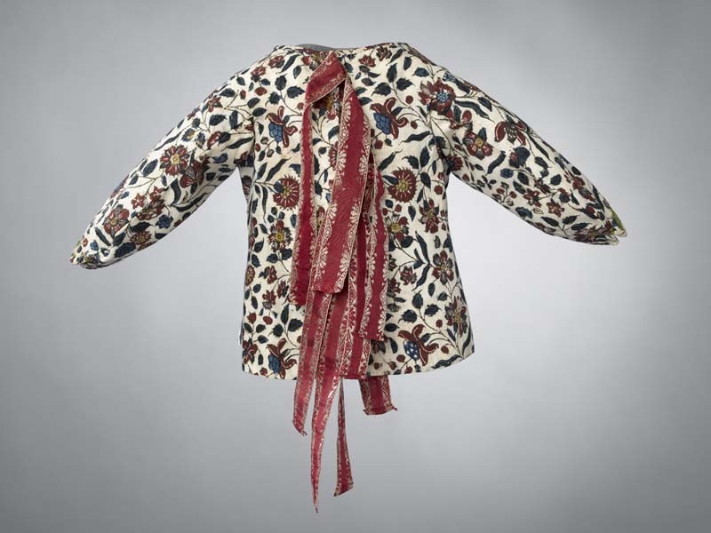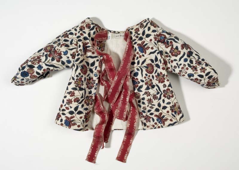 Sitsen babyjakje, dicht patroon van dunne bloemranken op witte grond, sluit achter met rode zijden linten