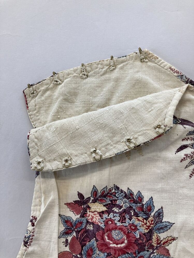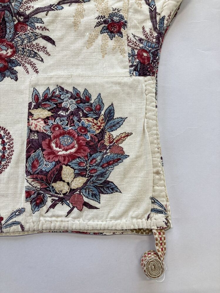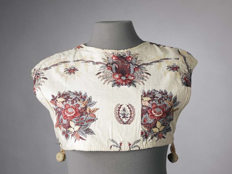 Bedrukt katoenen vrouwenkroplap ofwel onderst met symmetrisch patroon van losse ronde boeketten afgewisseld met veertjes en bloemmotiefjes op witte grond