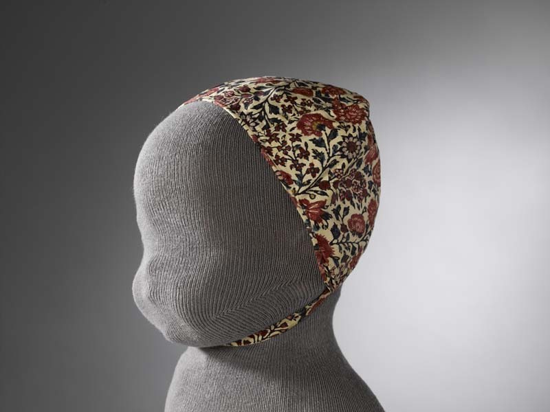 Sitsen meisjesmuts, met dicht patroon van kleine bloemetjes op witte grond
