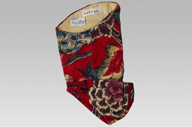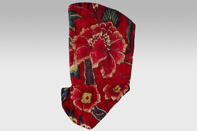 Sitsen meisjesmouwtje met manchet of 'barge-ear'(varkensoor) met rode bloemen op rode grond