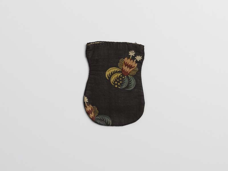 Bedrukt katoenen kinderwantje of mofje, motieven op bruine grond, zogenaamd 'nachtgrond'