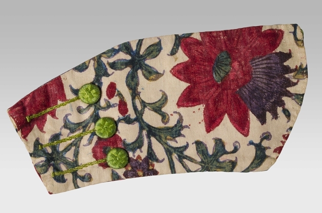 Sitsen jongensmouwtje, met stevige ranken en ronde bloemen op witte grond, versierd met drie groene zijden knoopjes