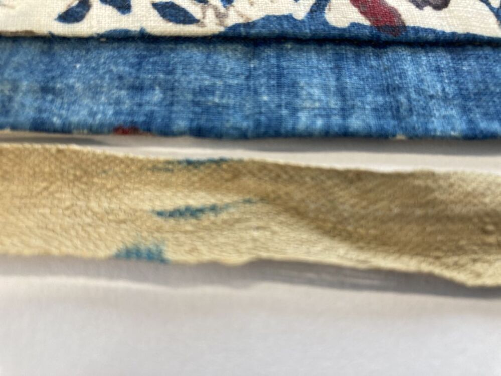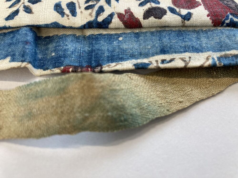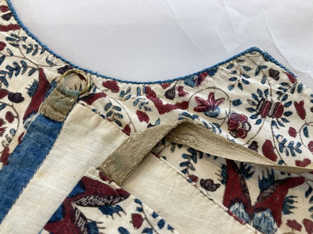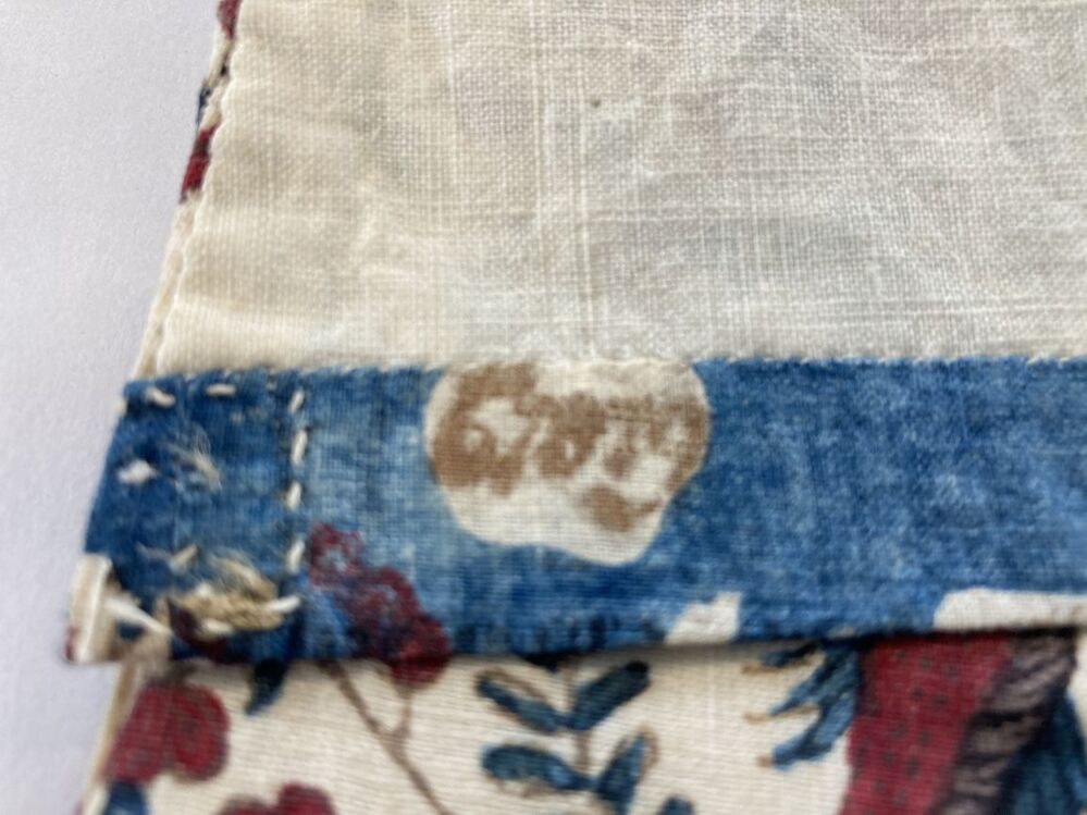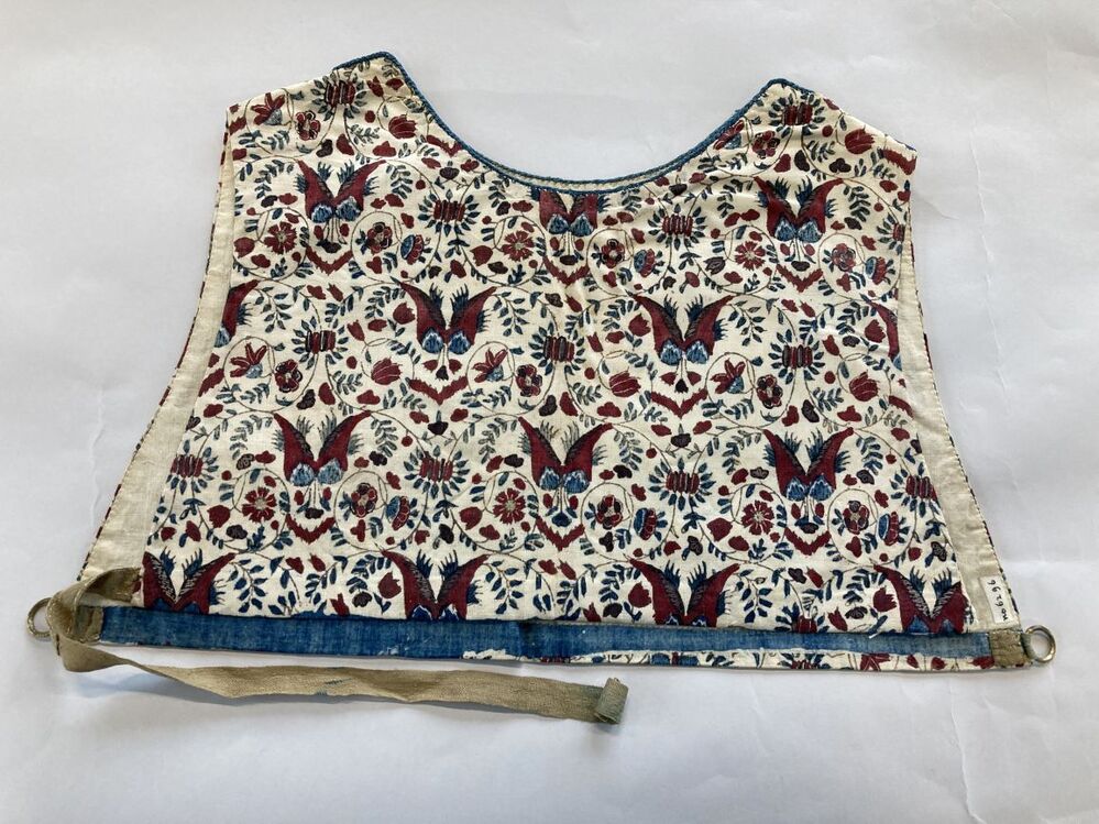 Sitsen vrouwenkroplap ofwel onderst, bedrukt en beschilderd met symmetrisch rankpatroon op witte grond