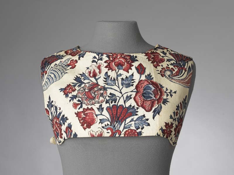 Sitsen vrouwenkroplap ofwel onderst, met ruitvormig geordende boeketten op witte grond, gemerkt HI
