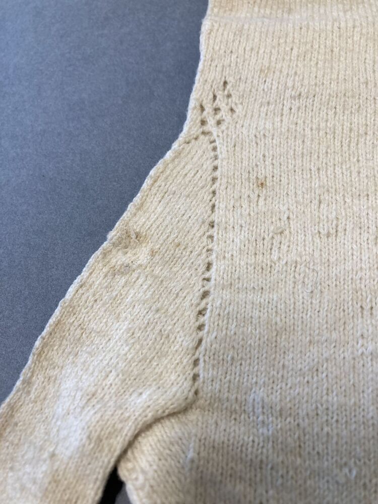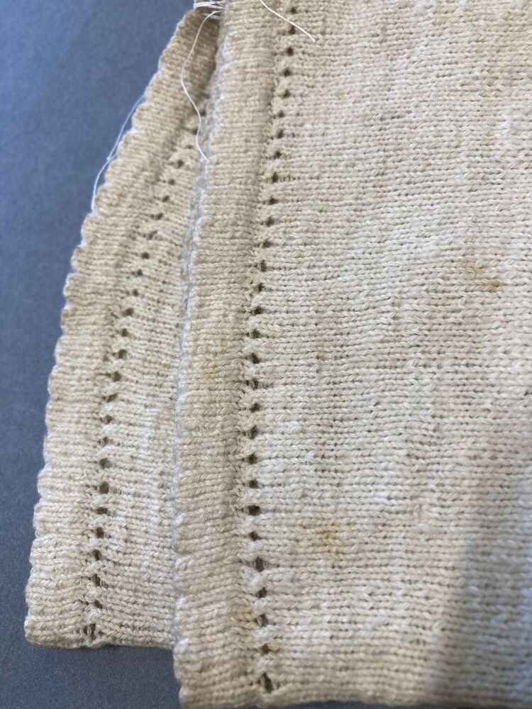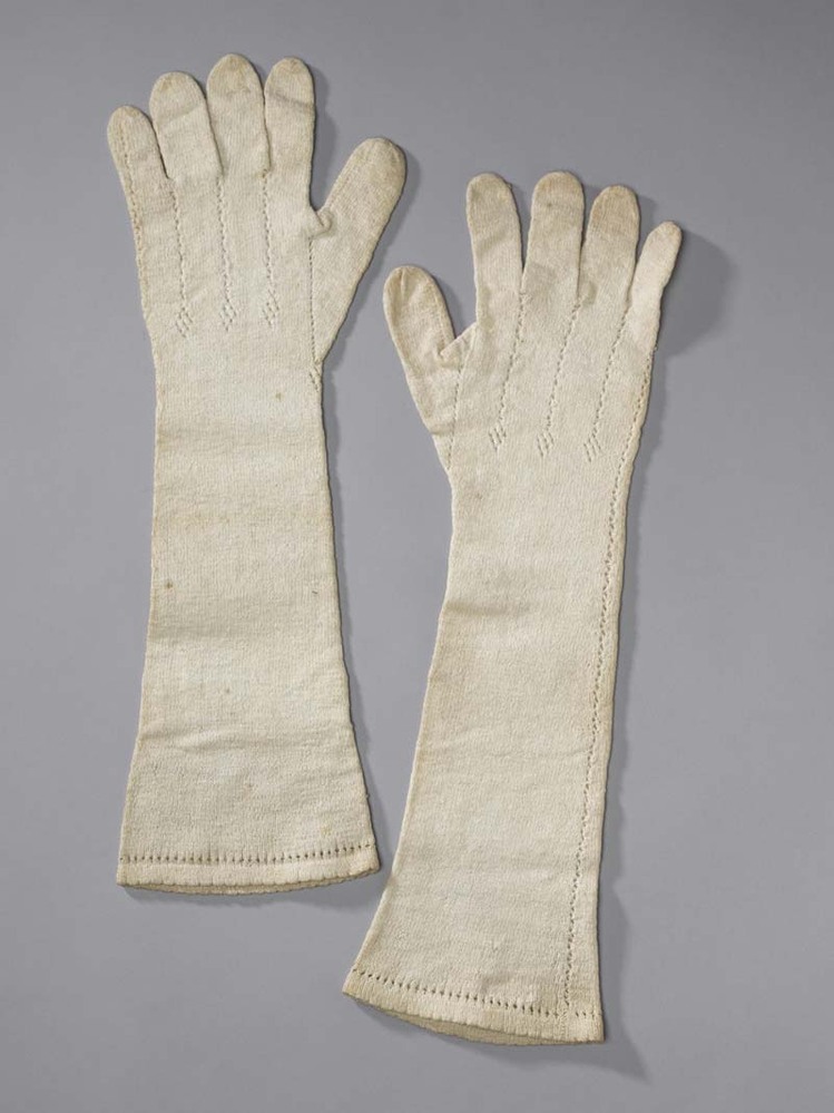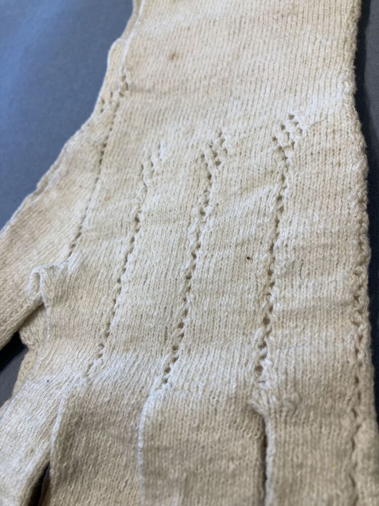 Paar lange witte gebreide katoenen handschoenen met ajour naadjes op de rug