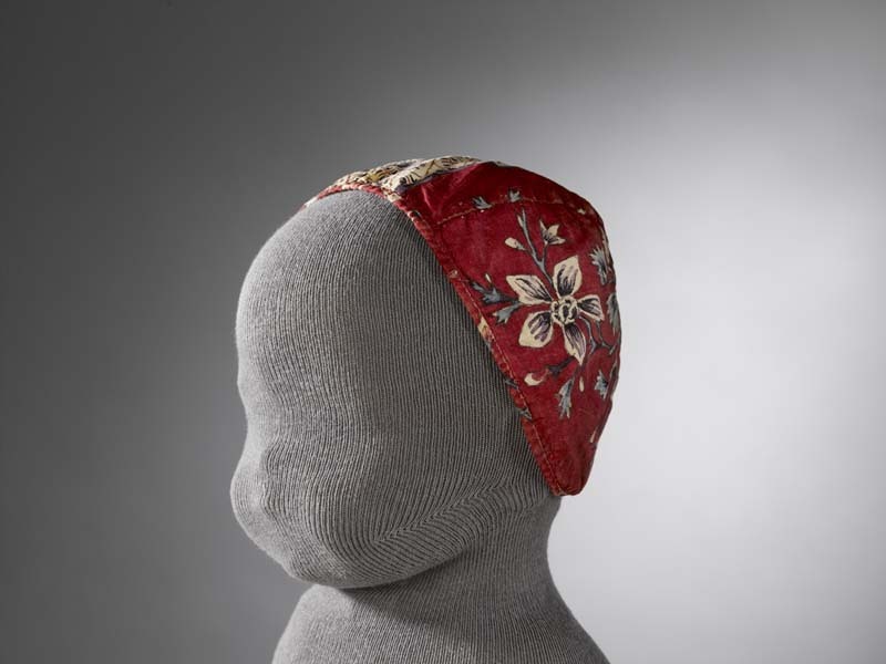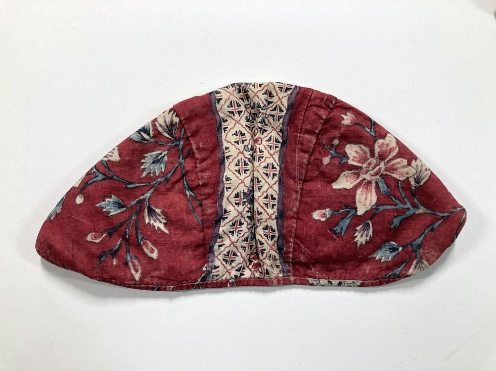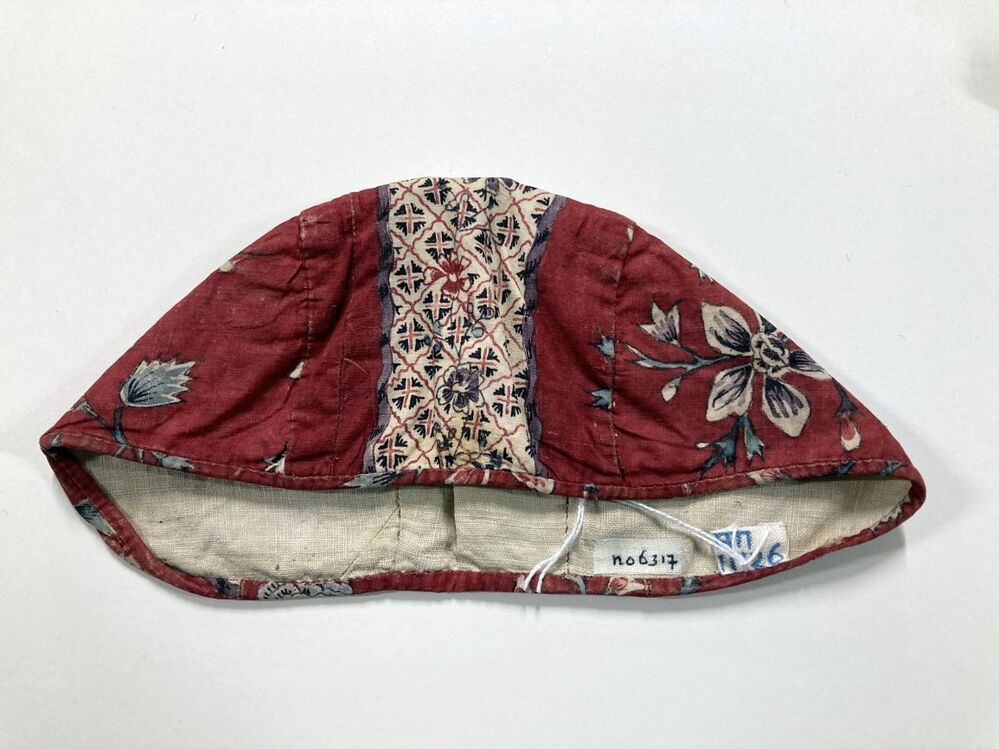 Sitsen meisjesmuts, beschilderd met band met rastervulling en naturalistische bloemstengels op rode grond