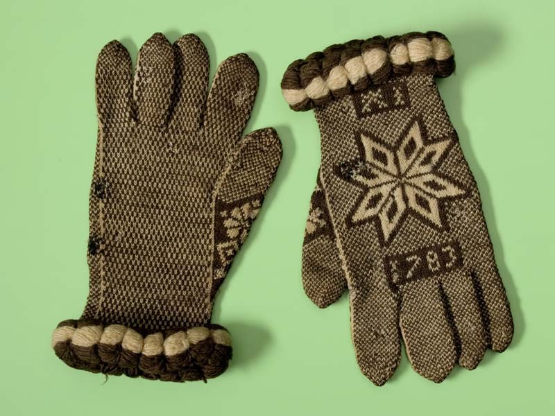 Paar gebreide handschoenen van bruin met witte wol met bolle rand langs de pols