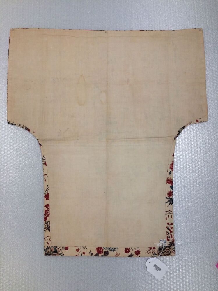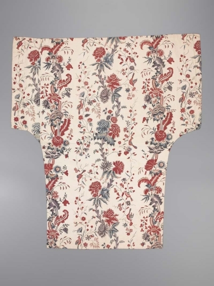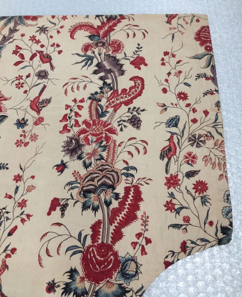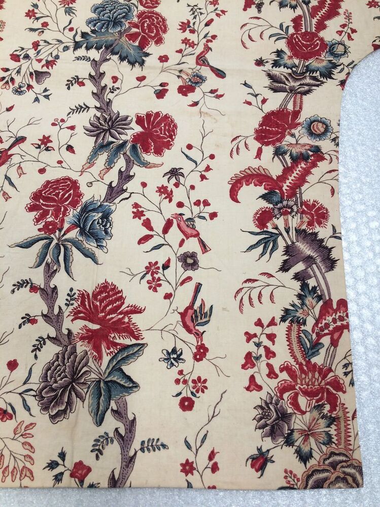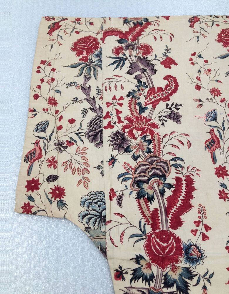 Sitsen wikkelkleed beschilderd met twee verschillende evenwijdige slingerende bloemtakken, waarvan een met dunne slingerende stengels met bloemetjes en vogels