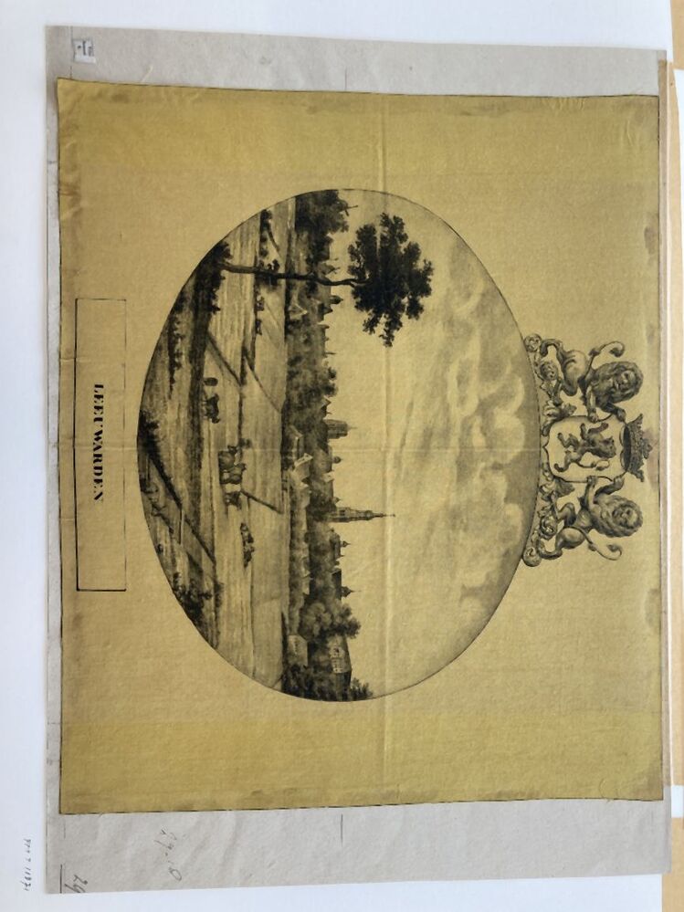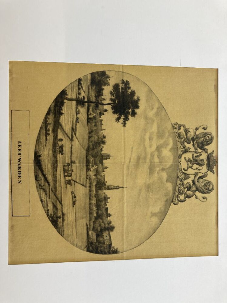 Fragment van gedenkdoek, met gezicht op Leeuwarden, geel met zwarte opdruk, uit groter geheel geknipt