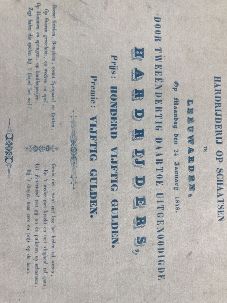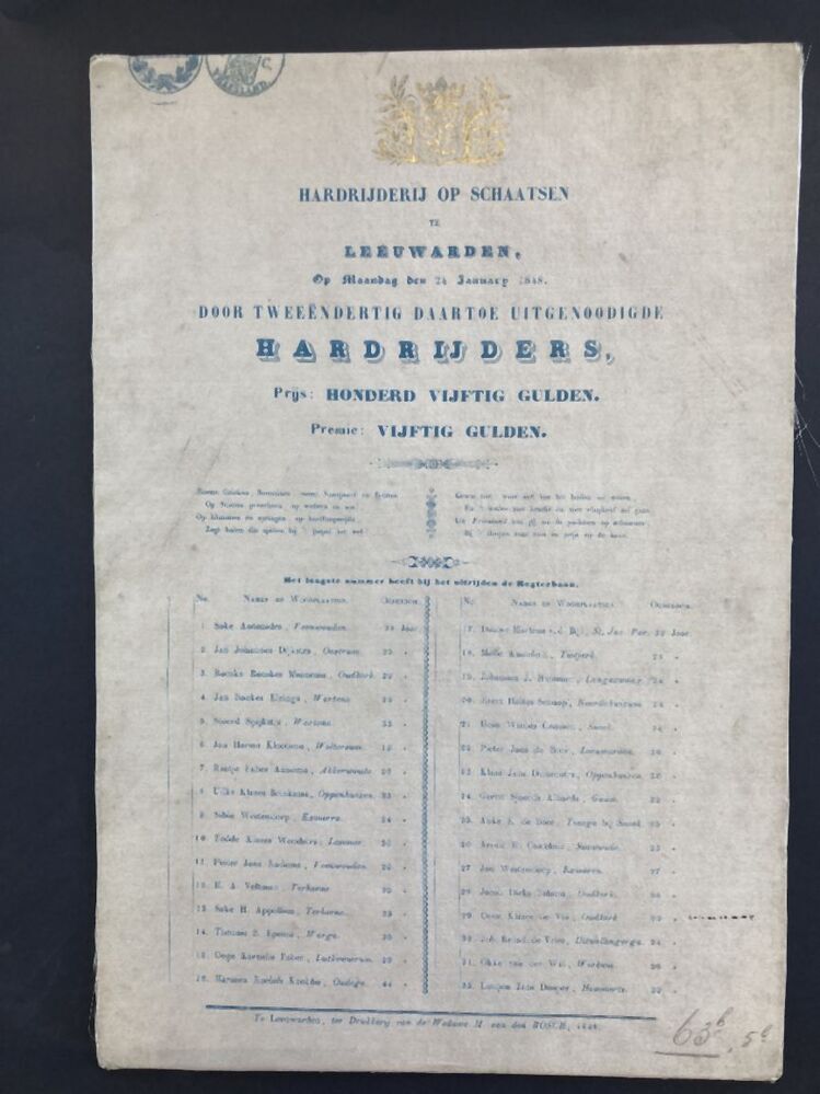 Drukwerk op satijnzijde, blauw en goud, hardrijderij op schaatsen te Leeuwarden, op maandag den 24 January 1848