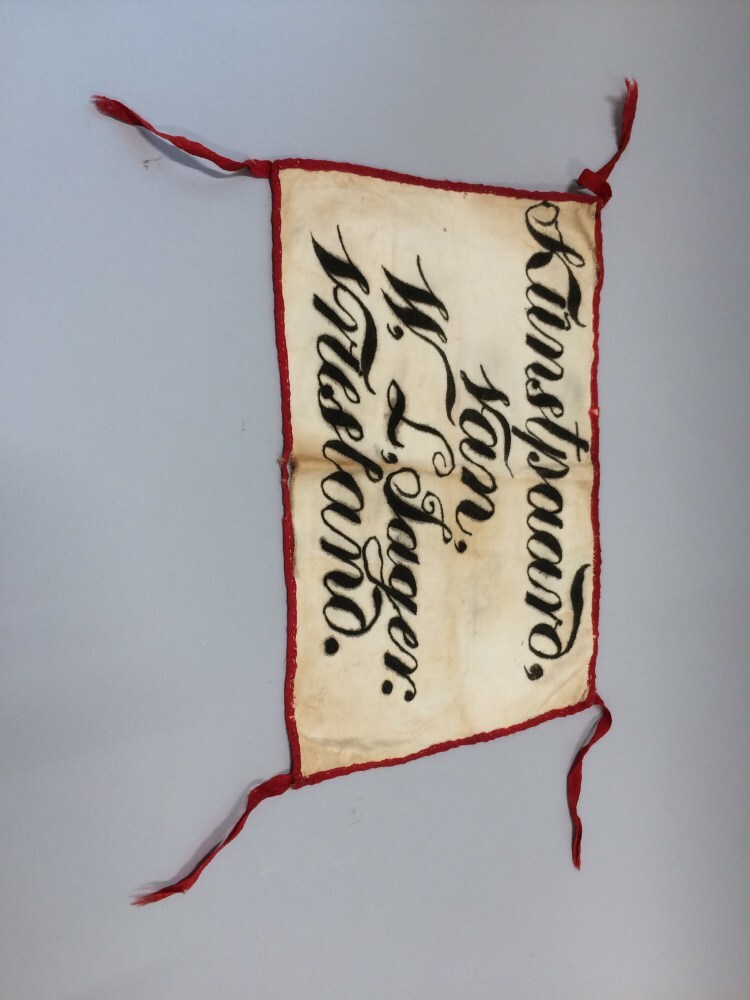 Doek met een geschilderde, geborduurde of gehandwerkte tekst, al dan niet verlucht met voorstelling en/of versiering. Herinnert aan een bijzondere gebeurtenis. https://data.cultureelerfgoed.nl/term/id/cht/76e07655-21d9-4611-bfd2-3eb27f815444