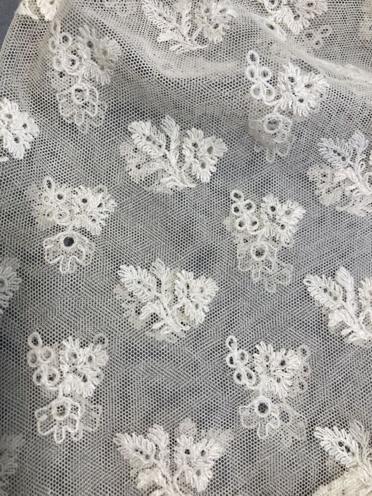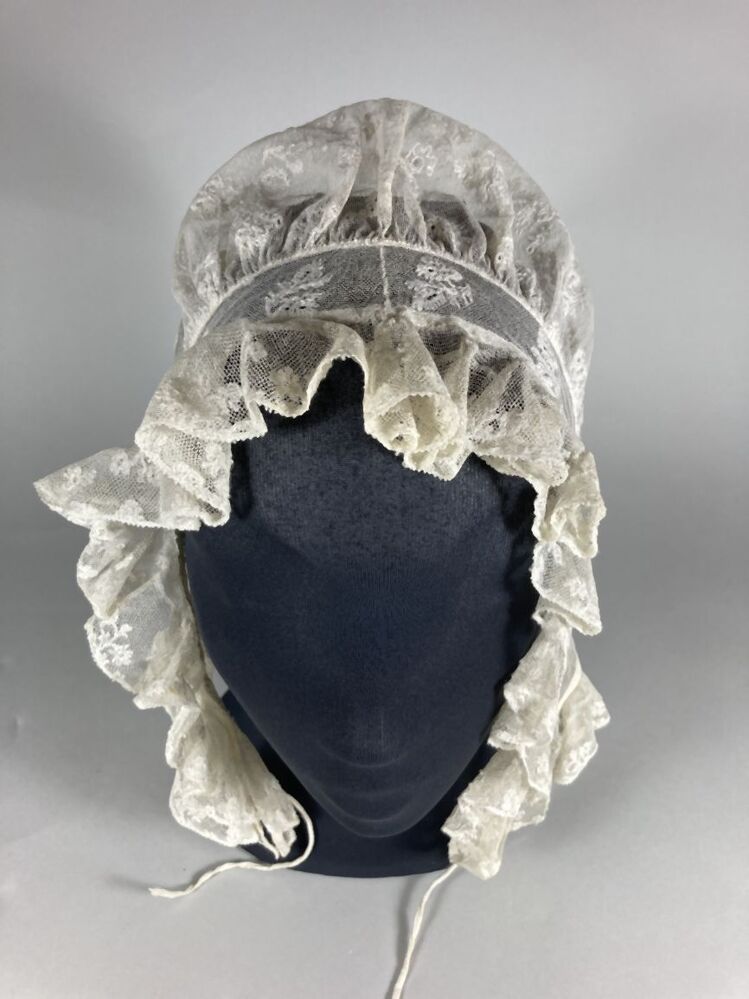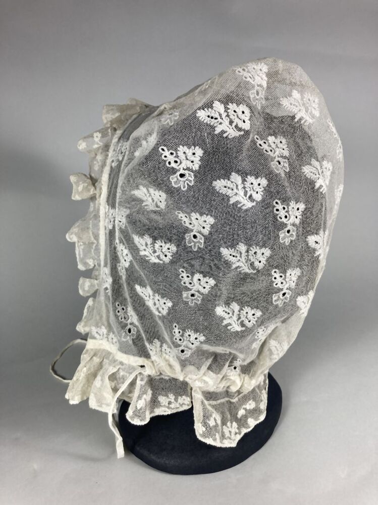 Cornetmuts van witte tule met doorgestopte florale motiefjes, afgezet met Rijsselse kloskant.
