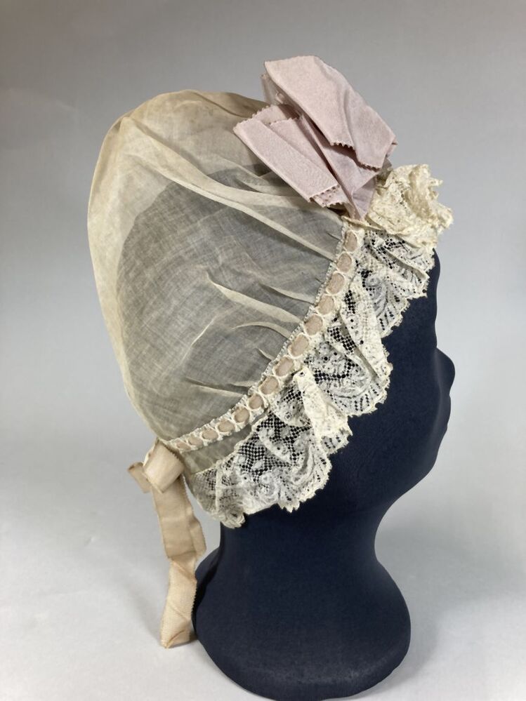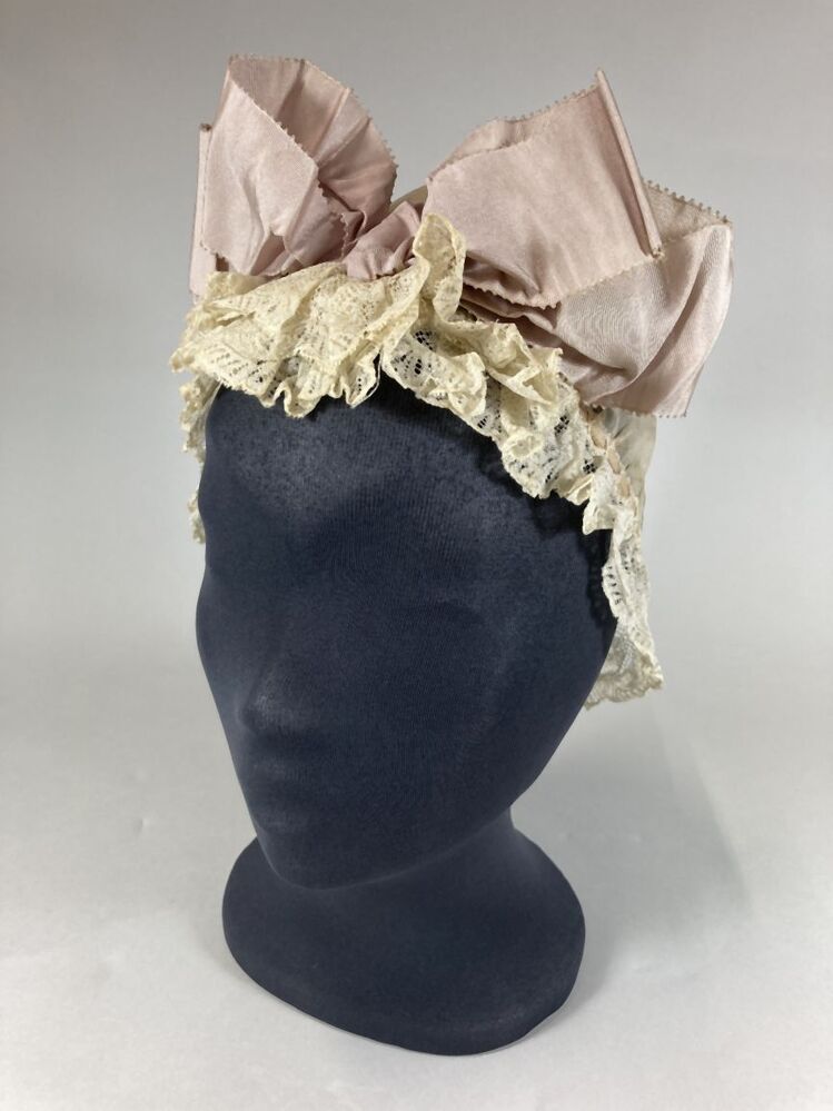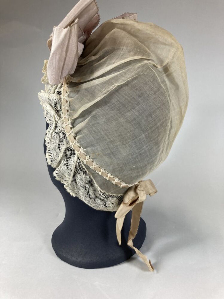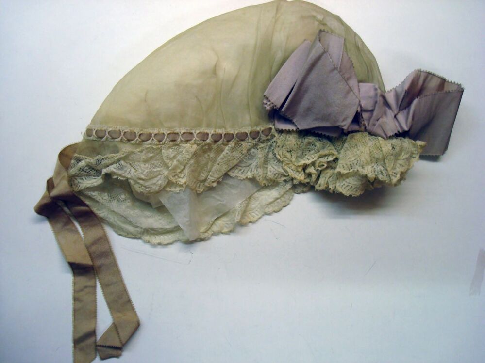 Muts van neteldoek, machinaal kant, lichtpaars zijden ribslint