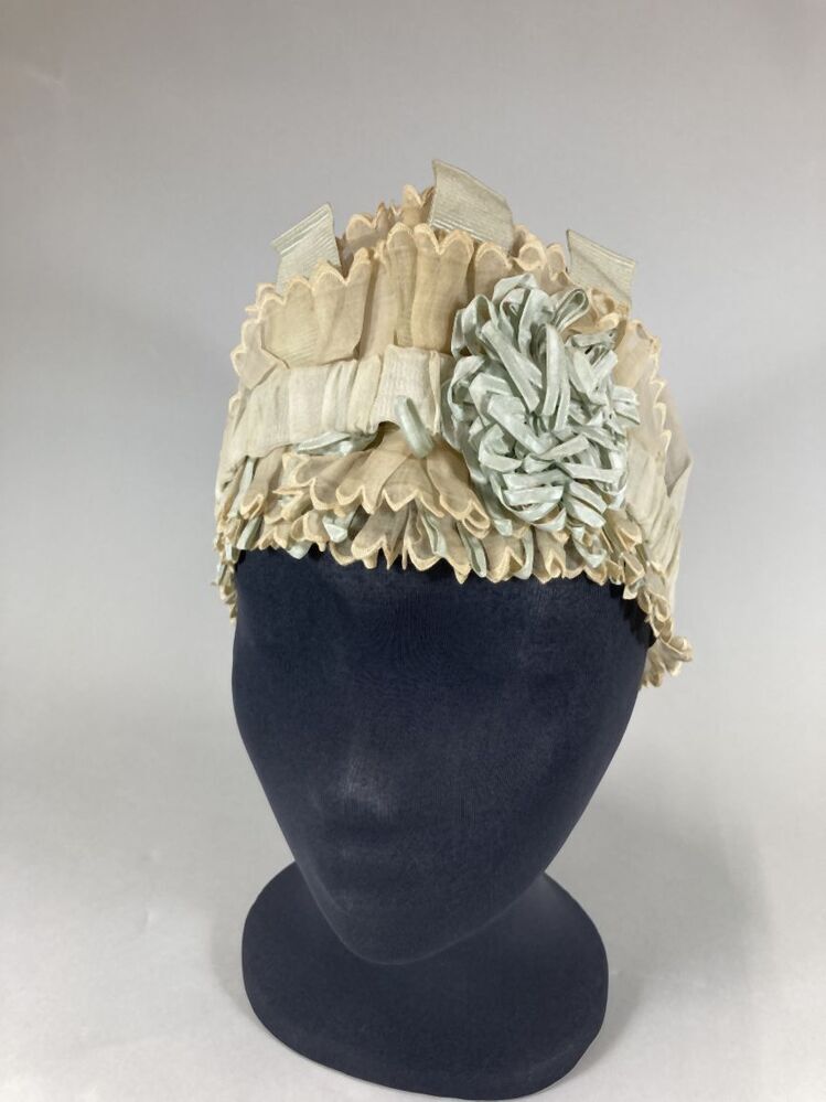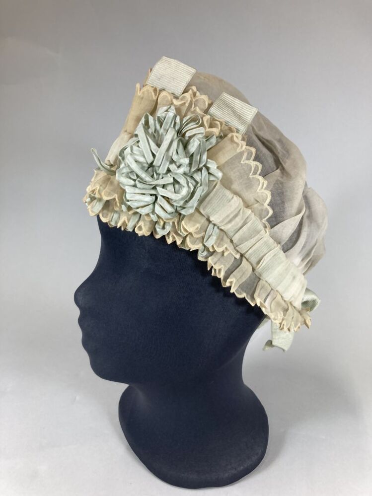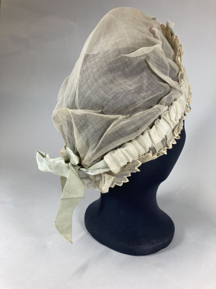 Muts van neteldoek met broderie, lichtblauw zijden lint